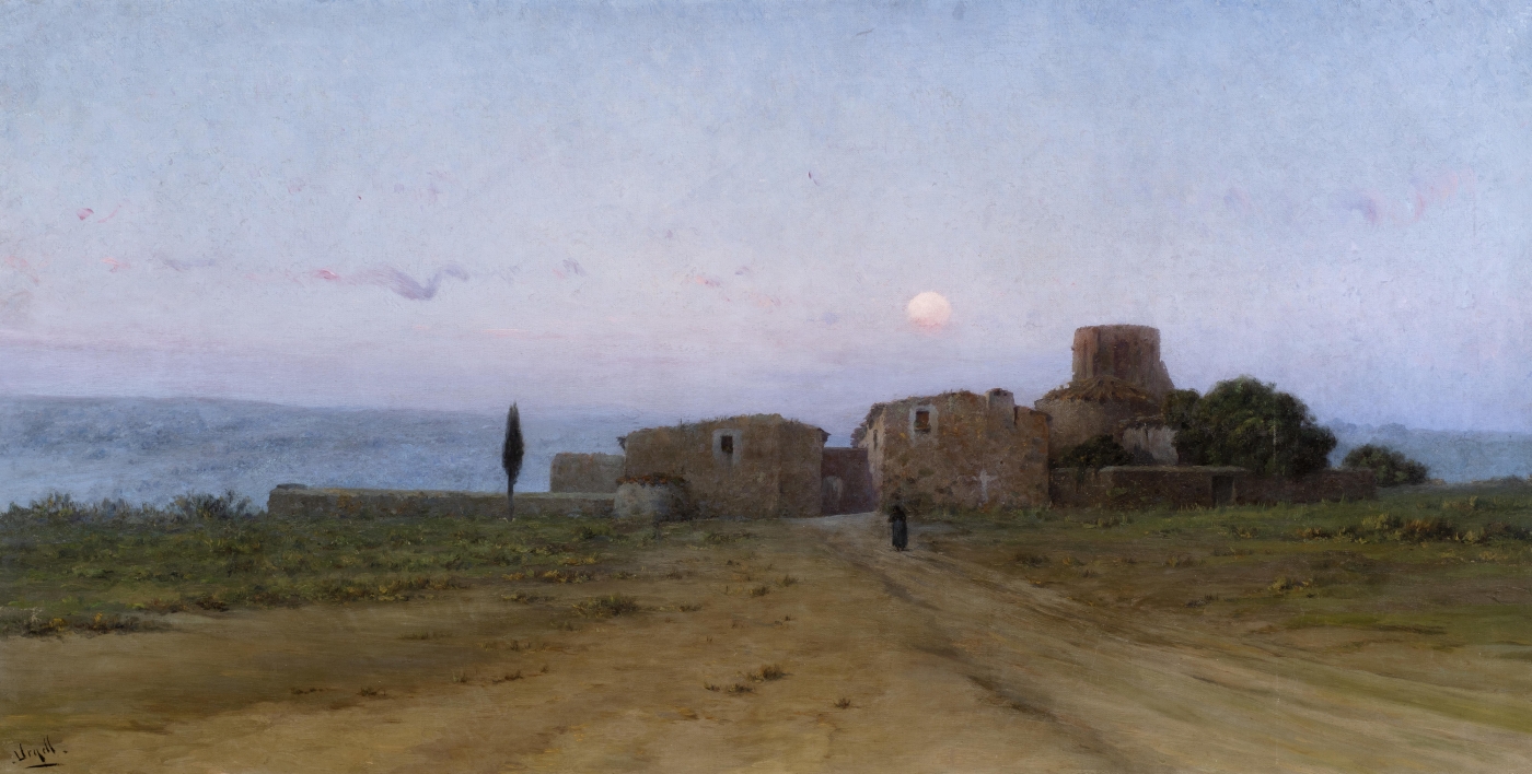 Village, figure and cypress tree