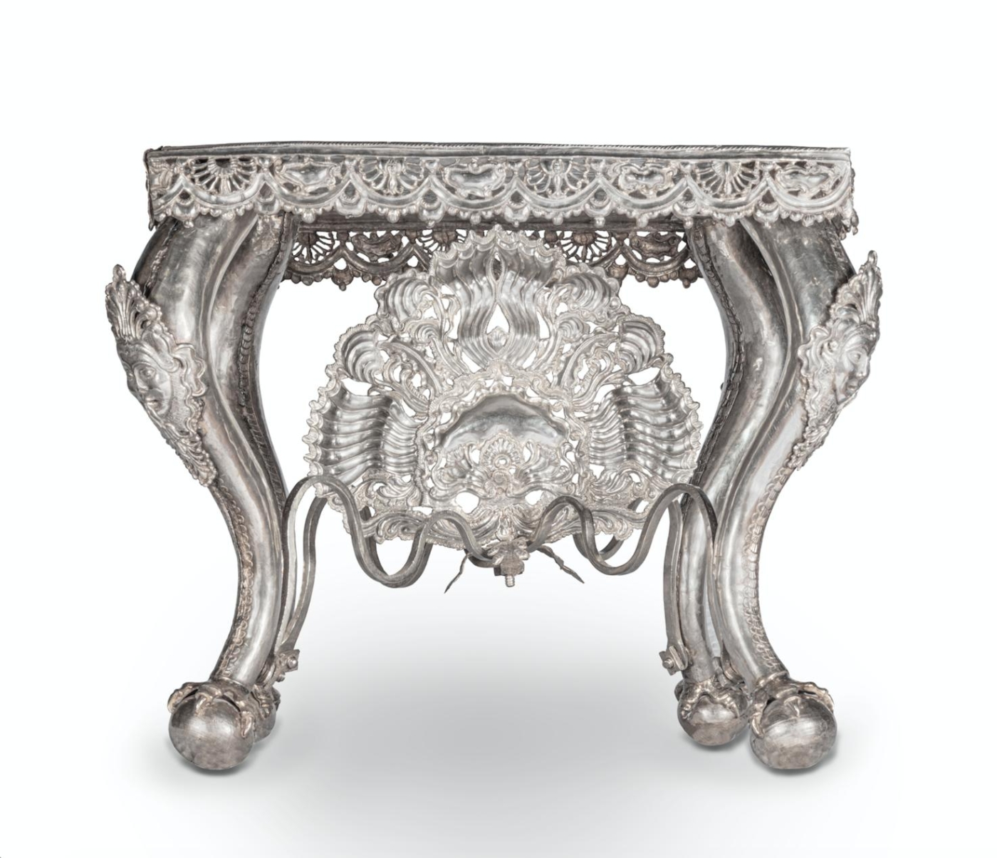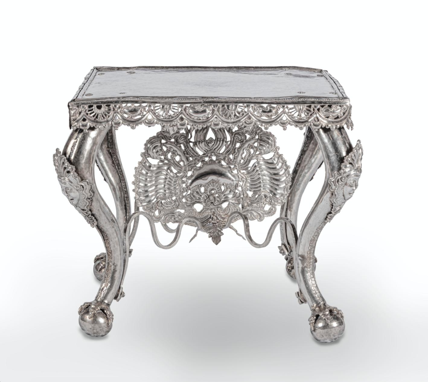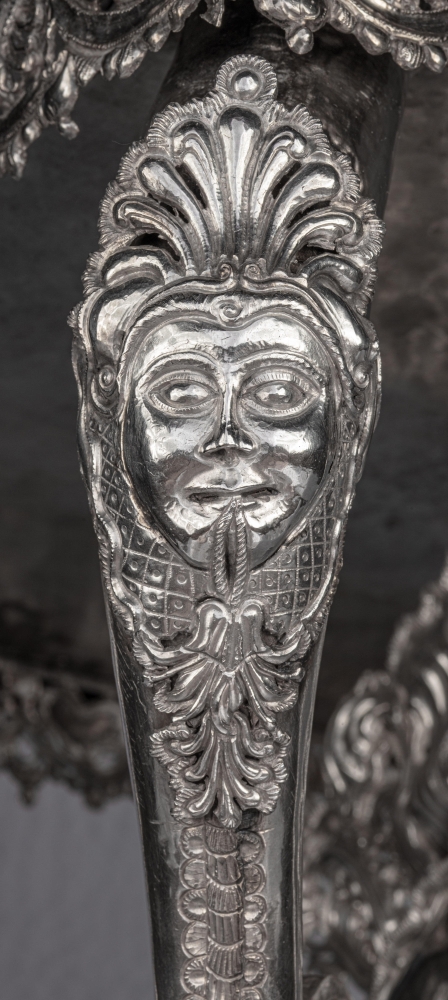 The unusual silver estrado table we have before us here has markedly curved cabriole legs, in the French fashion, and one is drawn to the Rococo style of its profuse ornamentation. The naturalist decoration presents figurative elements of a Western variety, which are combined with an indigenous New World stamp, thereby obtaining a marvelous mestizo style. This syncretism may be clearly identified in the four mascaroons on the bends of the legs, where the figures are depicted wearing feather headdresses, a cultural crossover characteristic of works from Upper Peru, setting a unique style. The tabletop is flat, with a plain surface lacking in any decoration, and a skirt on all four sides in richly ornamental openwork. Underneath the tabletop there is a large ornamental feature with leaves, scrolls and volutes using the same technique as the aforementioned openwork. The legs, which have curves and counter-curves in an “S” shape, rest on claws that grip balls.