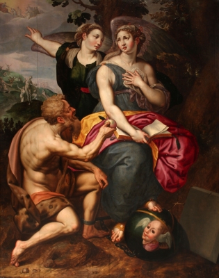 De Backer specialised in the production of complex symbolic images, of which our painting is a noteworthy example. The scene presents three monumental allegorical characters set in a wild landscape; behind them a series of ghostly figures scattered on a hill turn to the sky above them in emphatic gestures; on the clouds at the top left a seated figure draped in a red cloth receives a procession. While the scene in the background clearly depicts a Last Judgement, with the triumphant Christ crowning the resurrected in Heaven, the group in the foreground presents a more challenging exercise in iconological interpretation. One possible reading would be to identify the group as Faith triumphing over Sin. The seated young woman, dressed all’antica, one hand raised to her chest, the other resting on an open book on her lap, and a stone tablet at her feet, might, according to this interpretation, be thought to symbolise respectively the heart as the place of faith, the New Testament and the tablet of the Ten Commandments received by Moses on Mount Sinai; these three elements are common features of the traditional depiction of Faith, as would be later attested in Cesare Ripa’s Iconologia (1593). The half-naked man to her right, wrapped in a primitive speckled fur, looks up at the young woman with a grin and offers her an apple, the symbol of temptation par excellence, and an incarnation of Sin. Behind the two, an angel is attempting to redirect Faith’s attention, pointing to the heavenly procession; Faith, with a contrite expression, is immortalised in the struggle between Sin and Salvation. Under Faith’s left foot a green-glass globe, crowned by a golden cross, holds a mask, a bag of golden coins and a golden crown. This beautiful feature can be interpreted as an iconic encapsulation of the message: Christian Faith triumphs over earthly temptations.