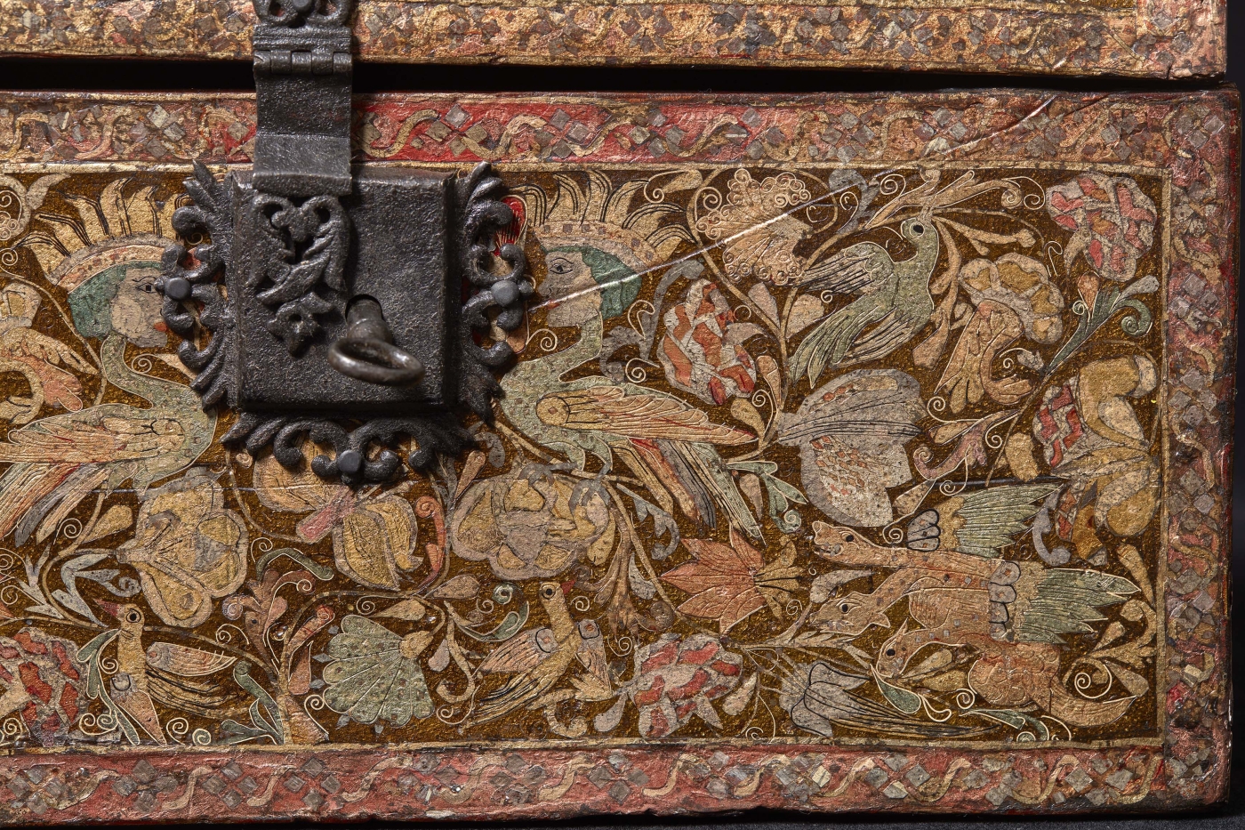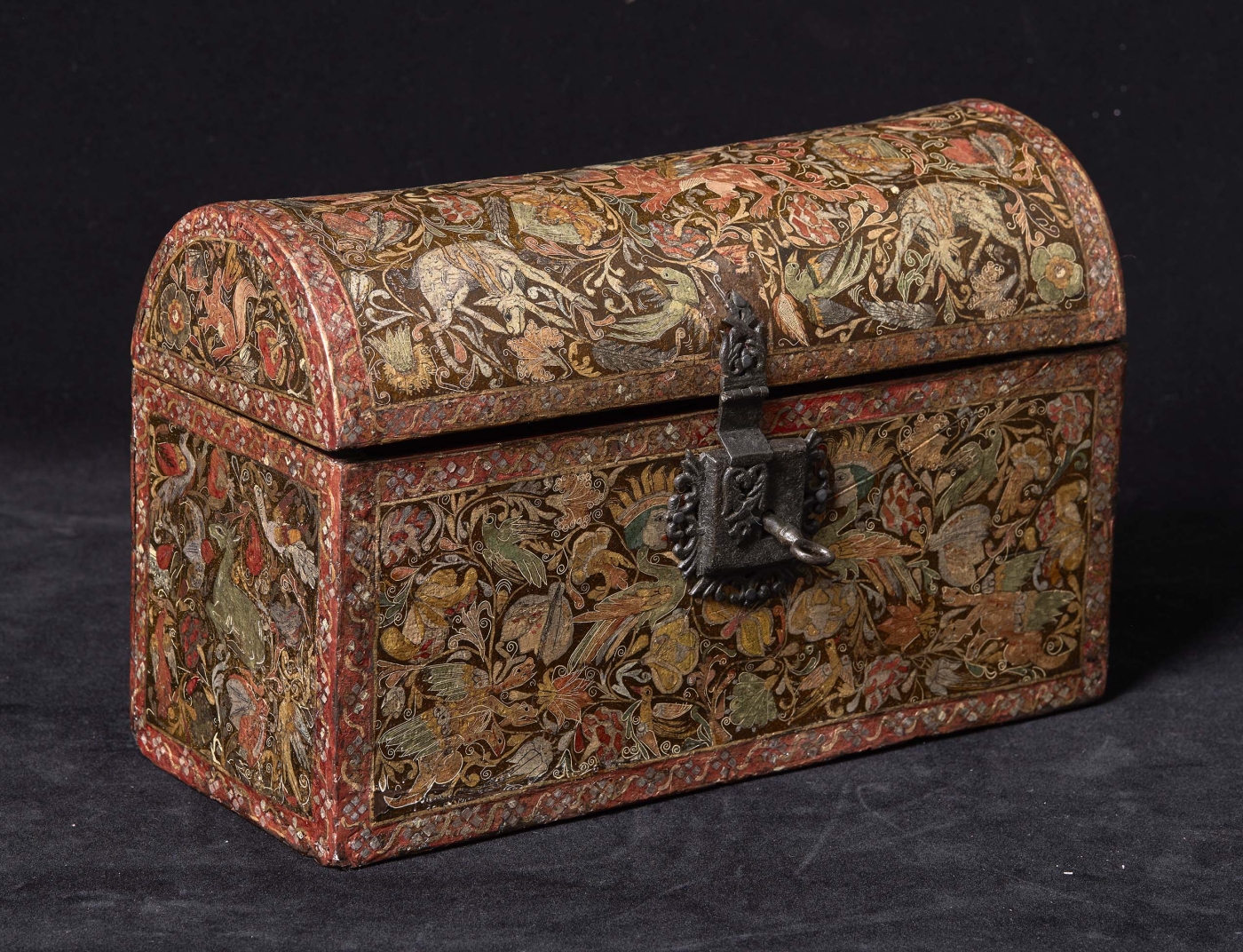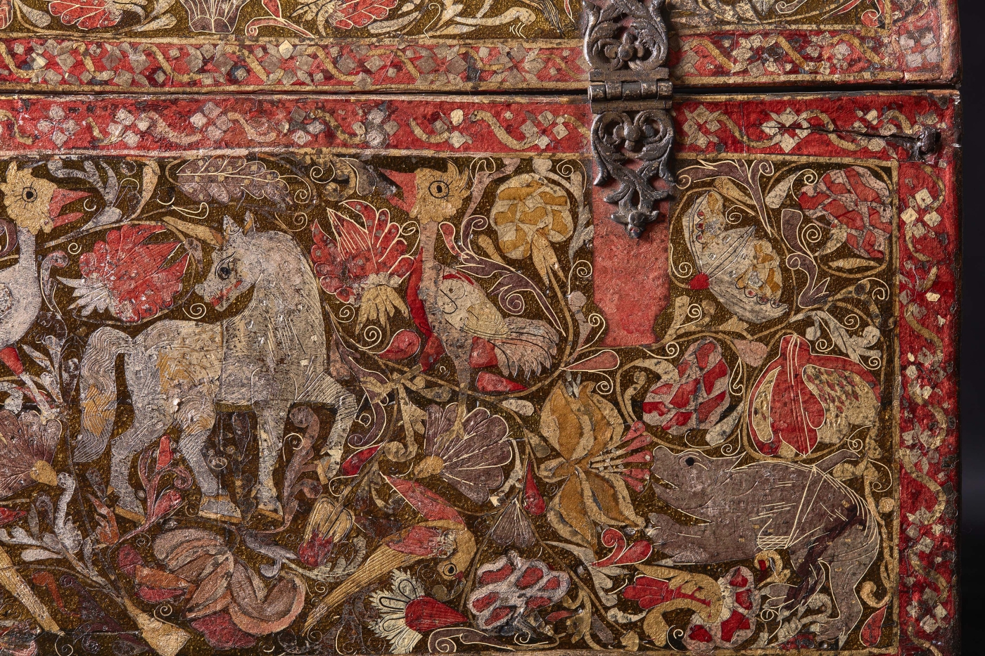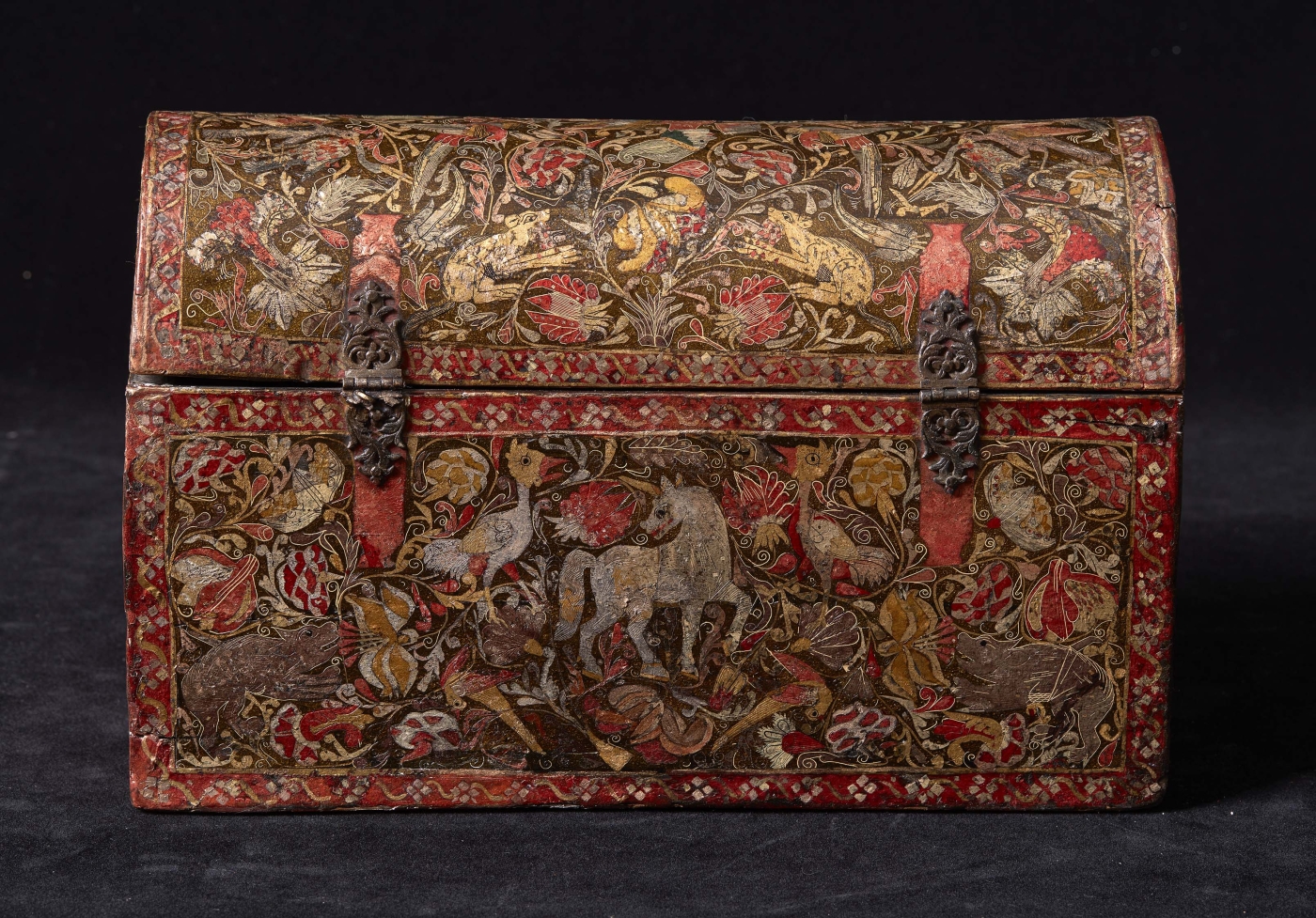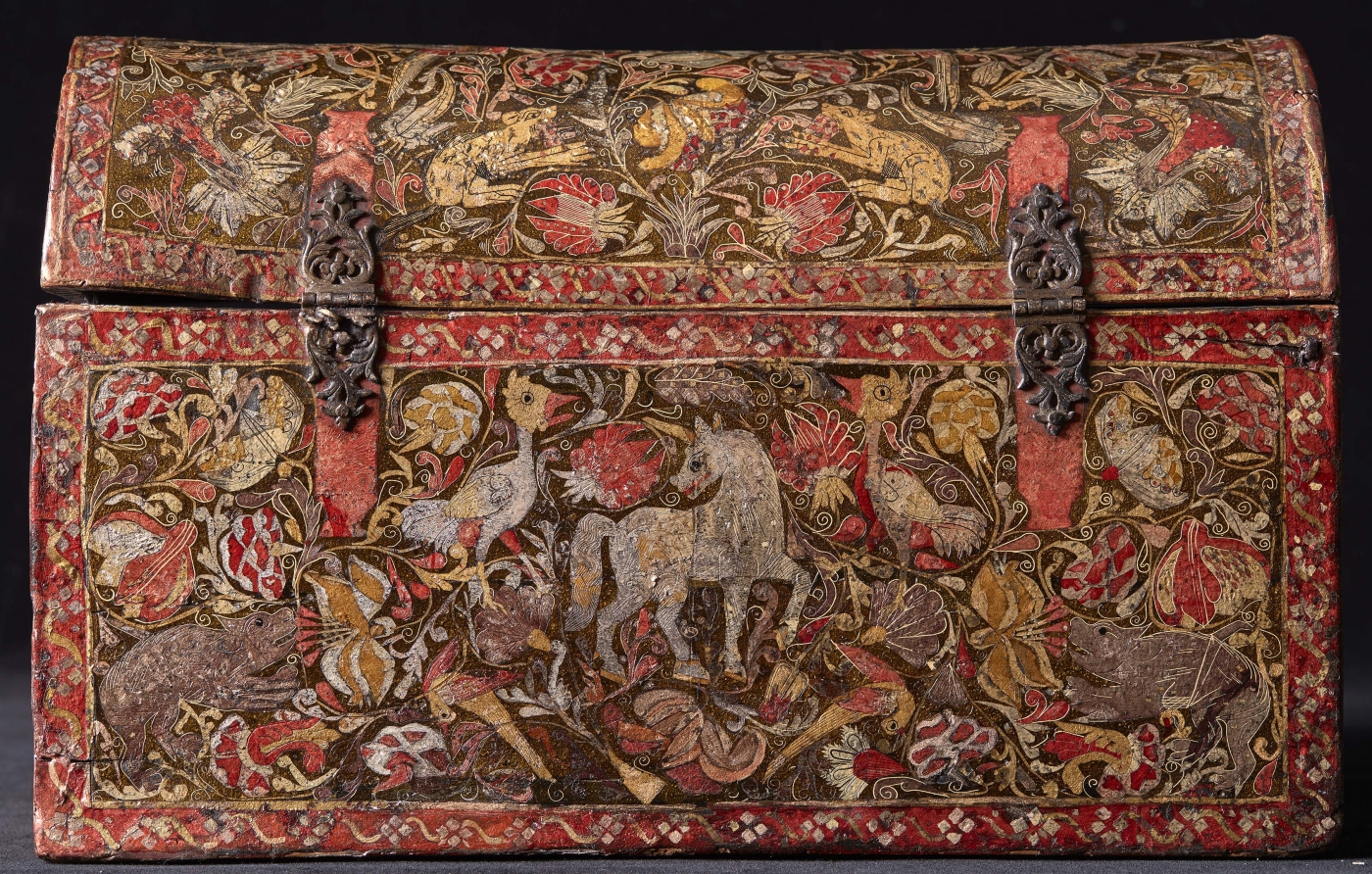 A chest with a rectangular body and semi-cylindrical lid. The structure is made of wood and the design is based on European models. The entire outer surface features profuse decoration in a horror vacui style typical of the European Baroque. It has been executed using a rich palette of light colours where layers of mopa mopa resin alternate with gold and silver leaf, lending the surface a beautiful iridescent colouring that gives off a radiant, golden luminescence. The design is replete with flora covering the entire surface other than where fauna dominates the scenes portraying birds, mammals and other hybrid and fantastical figures.