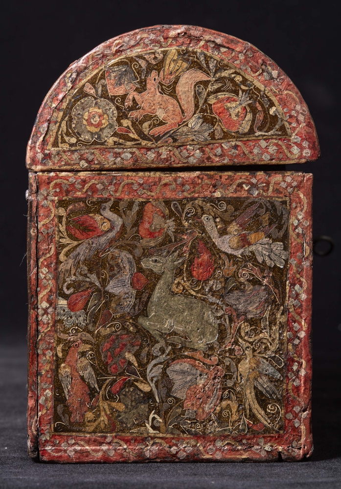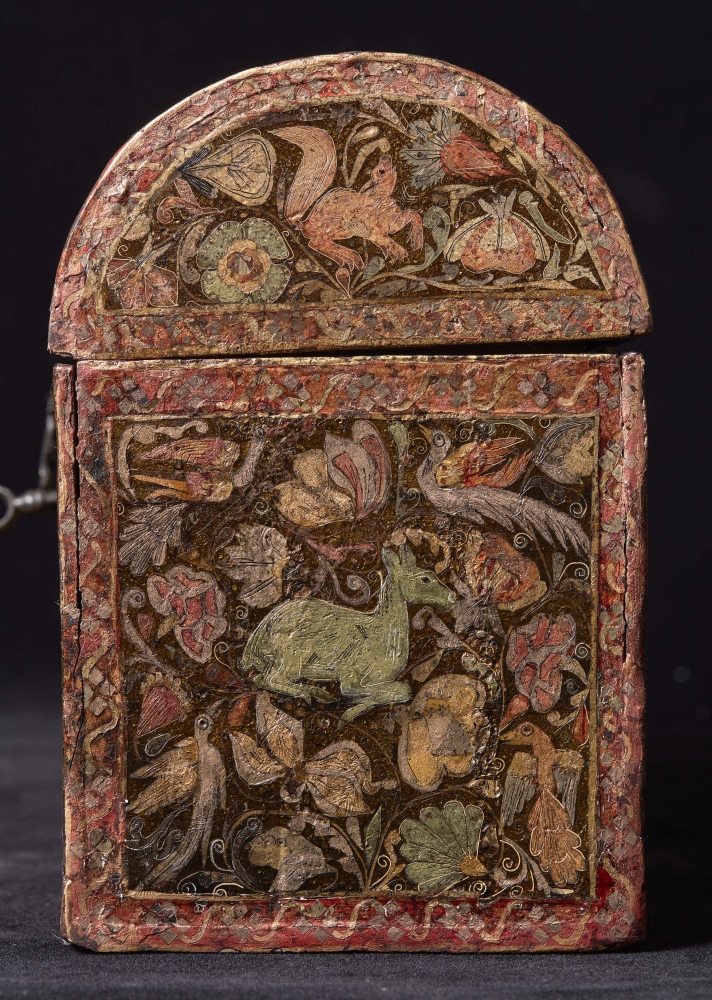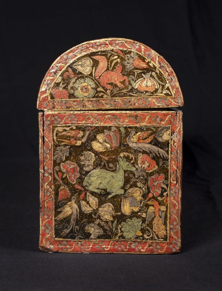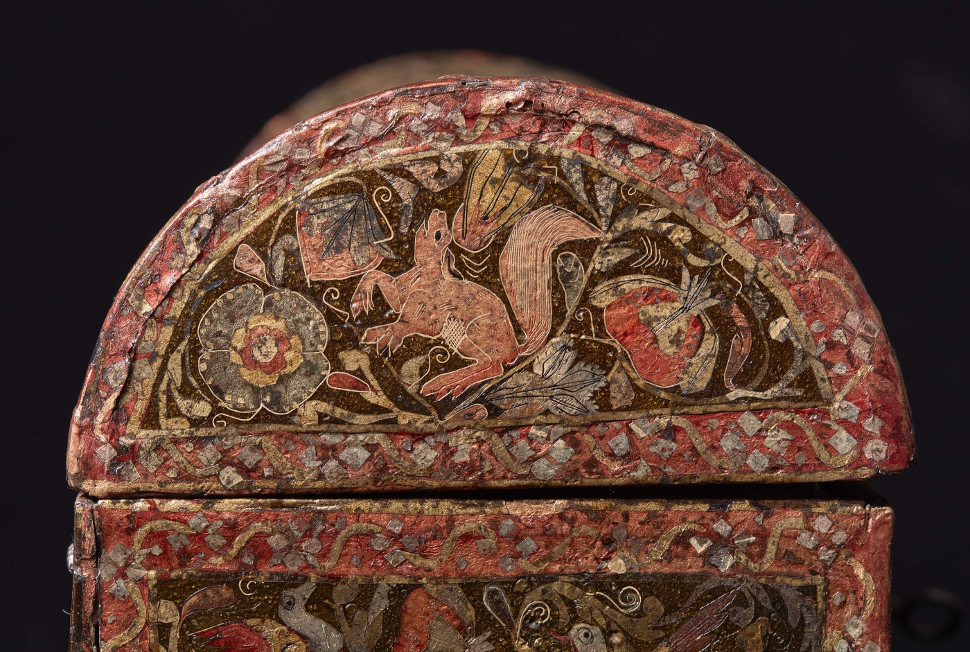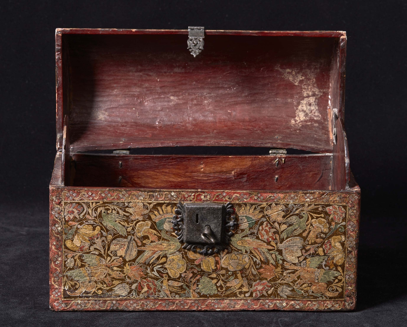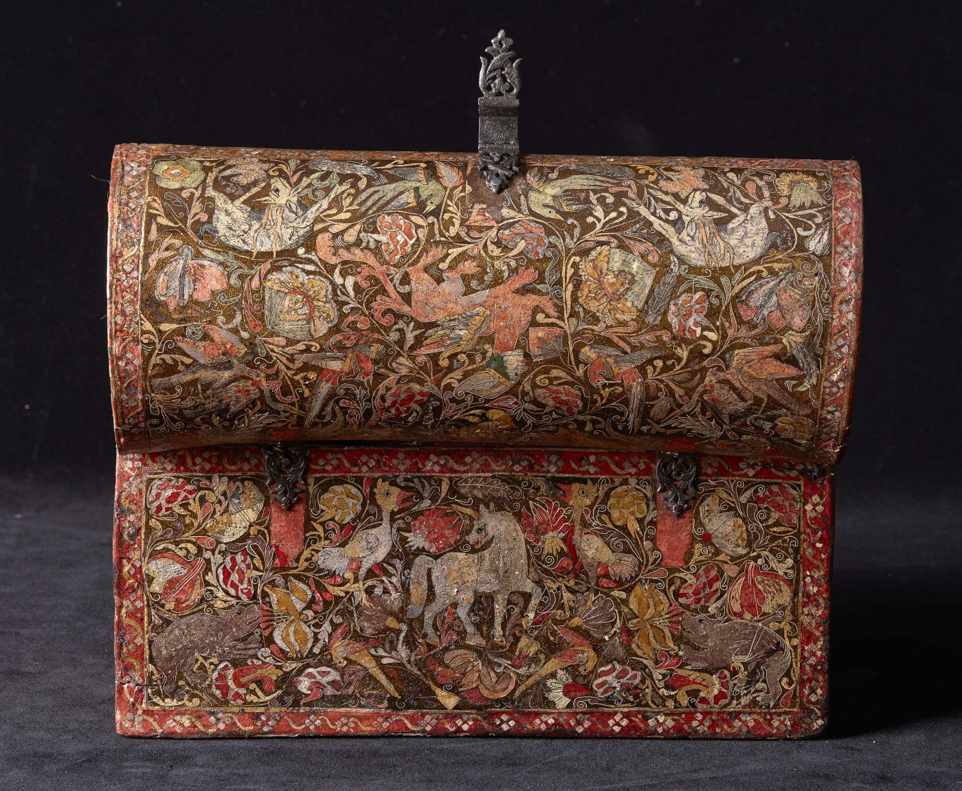 A chest with a rectangular body and semi-cylindrical lid. The structure is made of wood and the design is based on European models. The entire outer surface features profuse decoration in a horror vacui style typical of the European Baroque. It has been executed using a rich palette of light colours where layers of mopa mopa resin alternate with gold and silver leaf, lending the surface a beautiful iridescent colouring that gives off a radiant, golden luminescence. The design is replete with flora covering the entire surface other than where fauna dominates the scenes portraying birds, mammals and other hybrid and fantastical figures.