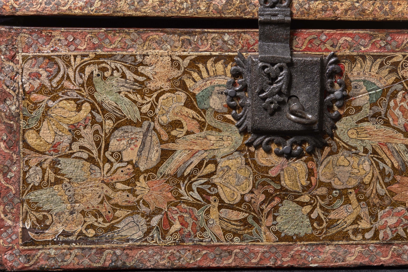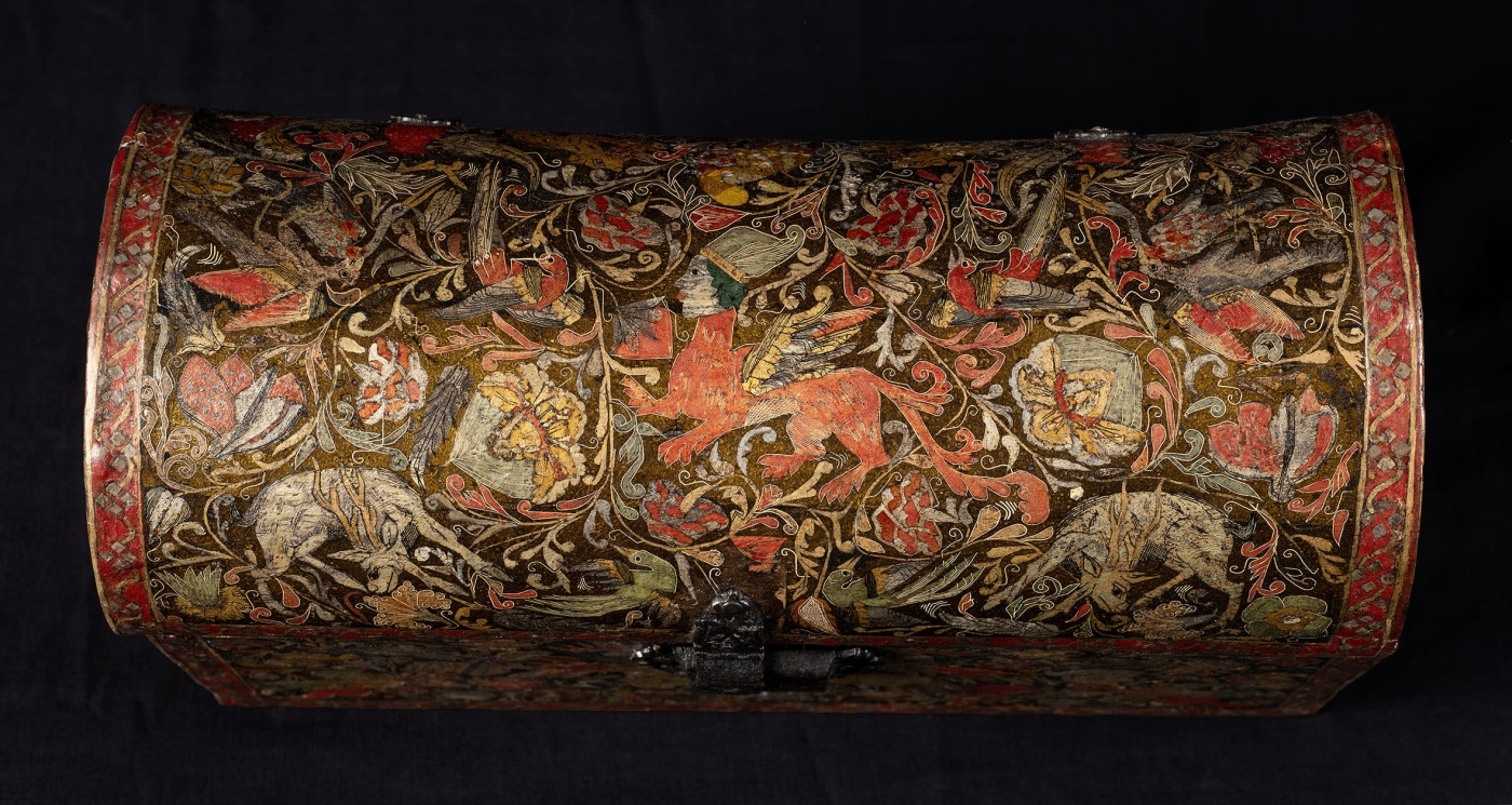 On the front of the chest we can observe a pair of harpies opposite each other with stylized avian bodies and female faces topped by ostentatious crowns of feathers. The figures dominating the scene are surrounded by profuse floral decorations, some drawing inspiration from Oriental lacquerware, such as peonies and carnations, alongside other native flowers. Delicately-executed birds sip from the flowers while joyful butterflies of varying species flutter in amongst them. The two lower corners feature two fantastical three-headed birds.