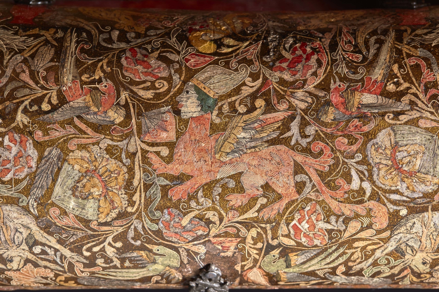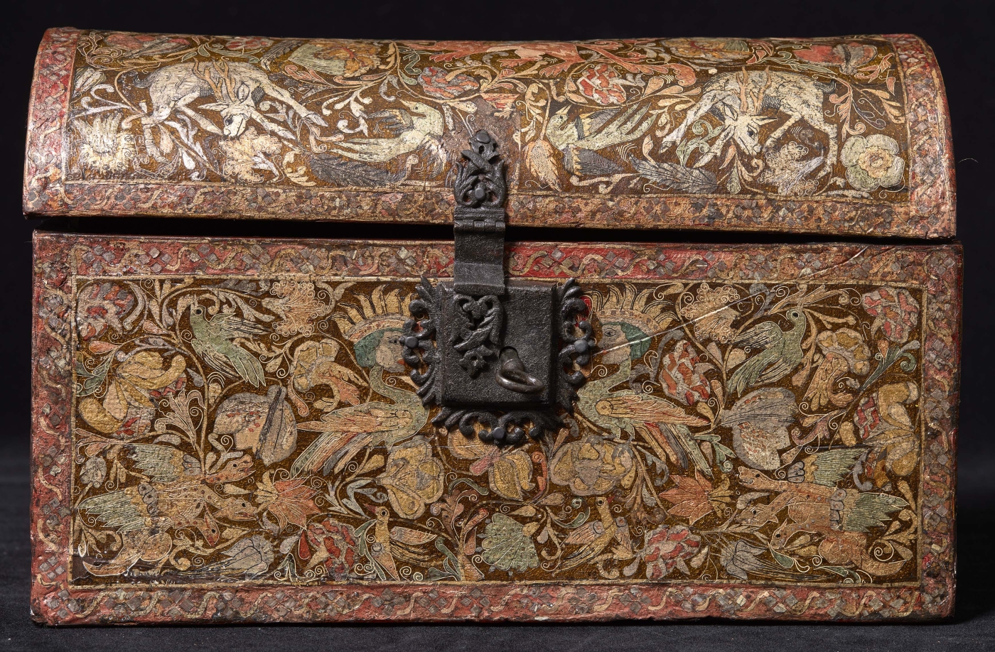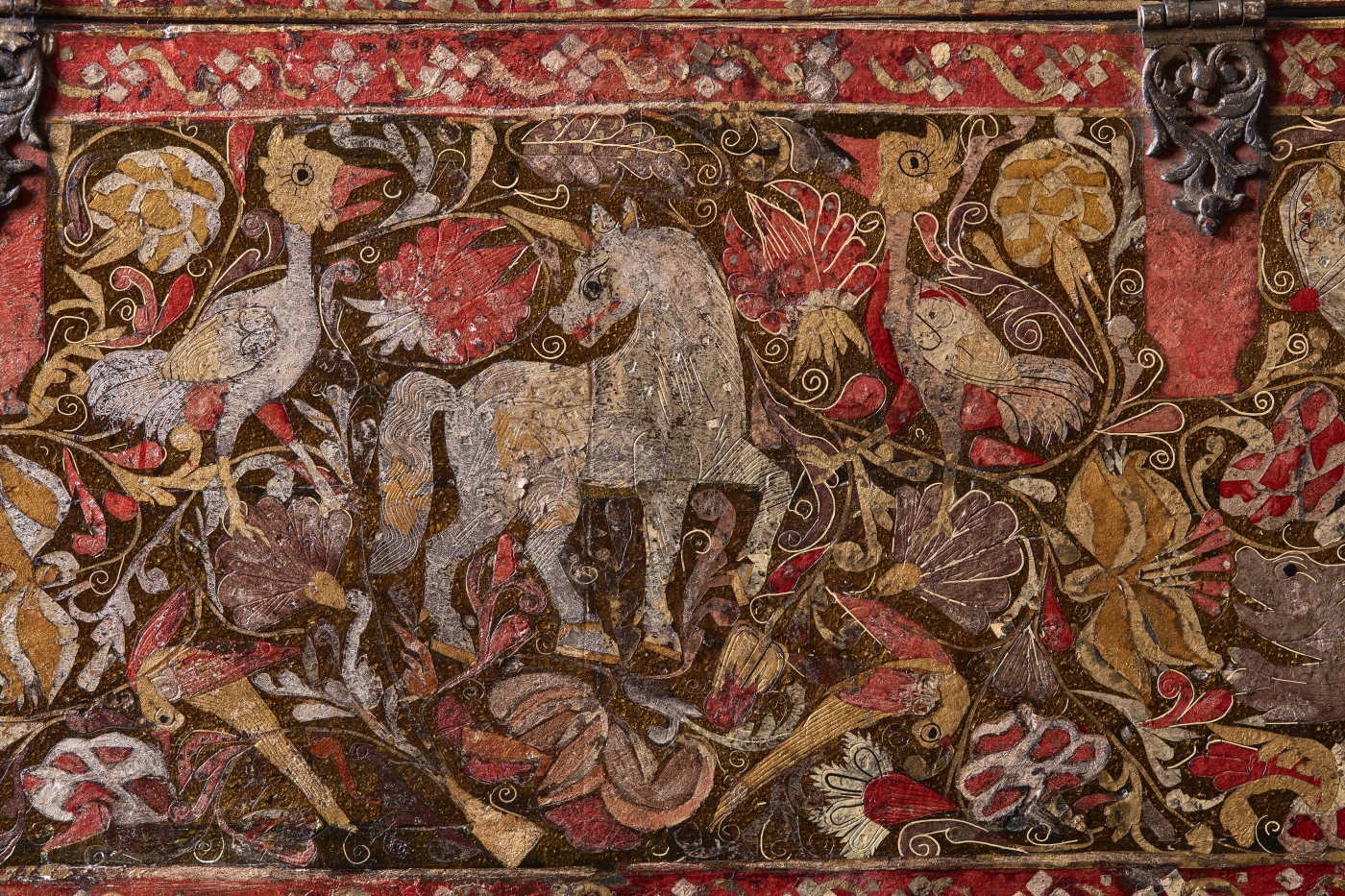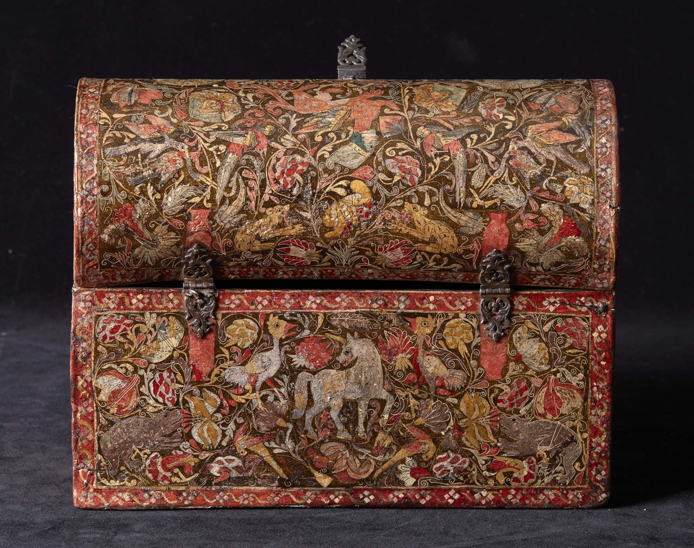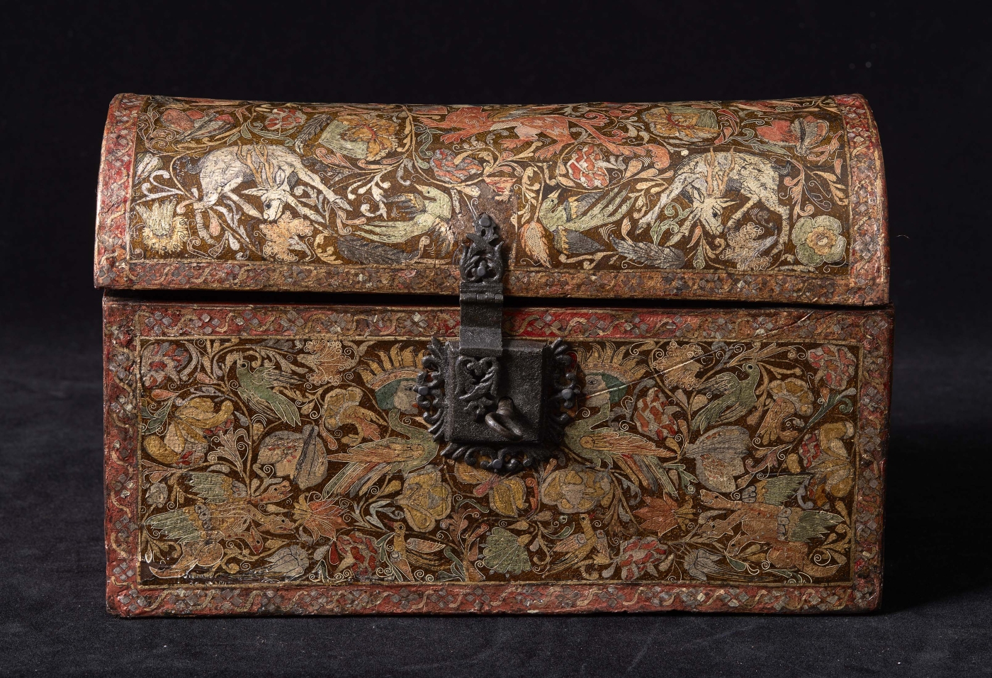 The lid, which is convex, has a winged sphynx in the middle of it, boasting attractively-coloured plumage and a face with indigenous features, crowned by a feathered headdress. Above this regal figure we observe a splendid, red-plumed macaw joyfully pecking at an enormous pomegranate. In the two front corners there are a couple of magnificent stags with huge antlers, smelling the delicious fragrance that appears to be emanating from the beautiful flowers at their feet. In the opposing central section, two hyenas, facing each other, have blood dripping from their mouths, clearly resting after a fruitful hunt, while a pair of enormous birds of prey are flying with recently-captured birds in their beaks. The scene is completed with a wide range of tropical rain forest vegetation as seen in the rest of the chest and featuring the same compositional design.