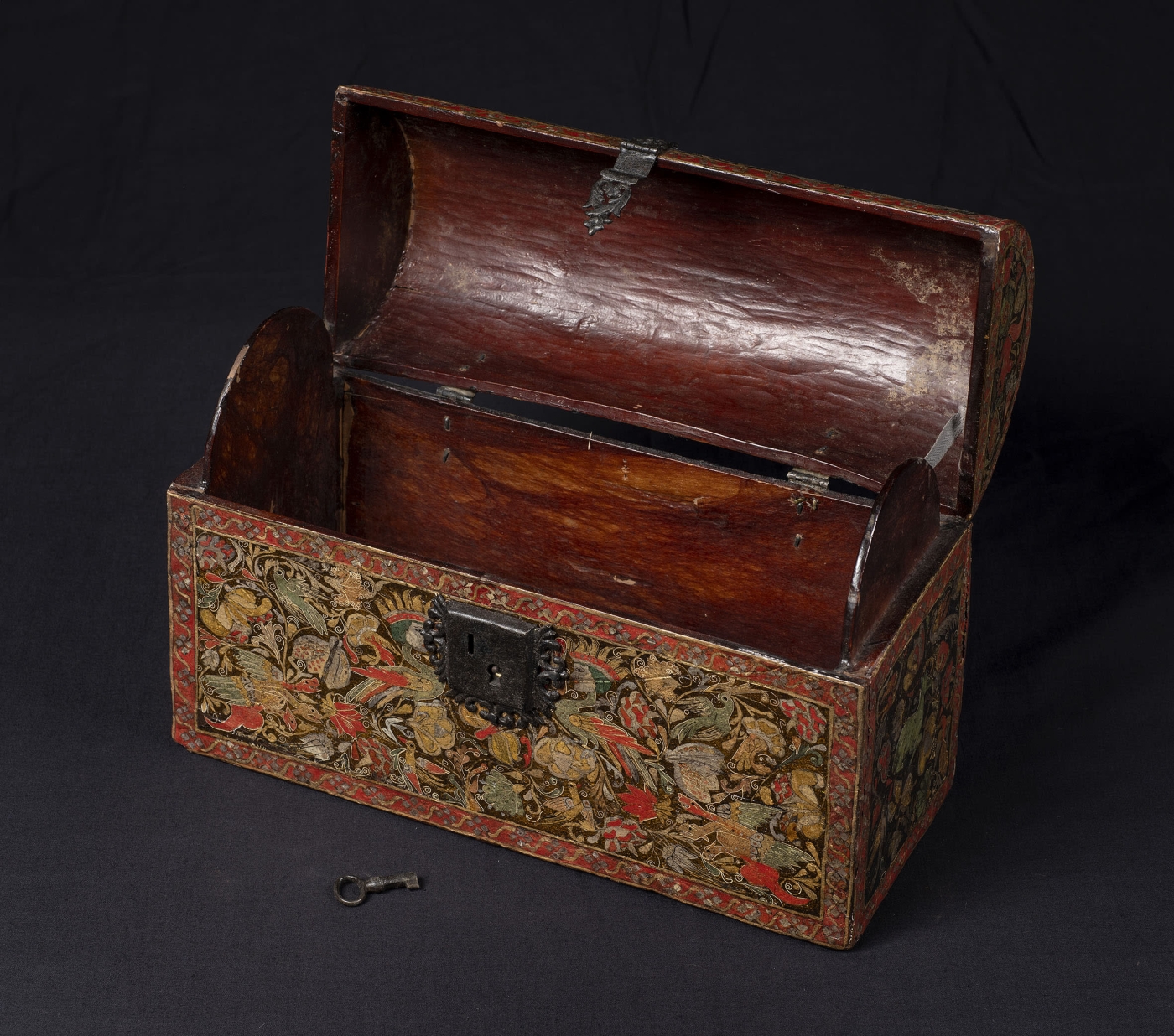 The chest mounts are made of iron and the keyhole has a plain front with worked edges making it look like a cartouche. Both the latch, with goes into the lock, and the two hinges, present the same decorative design, with scrolled openwork.