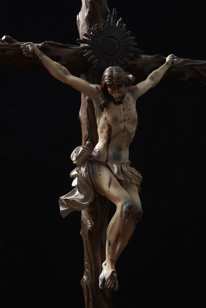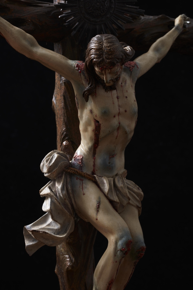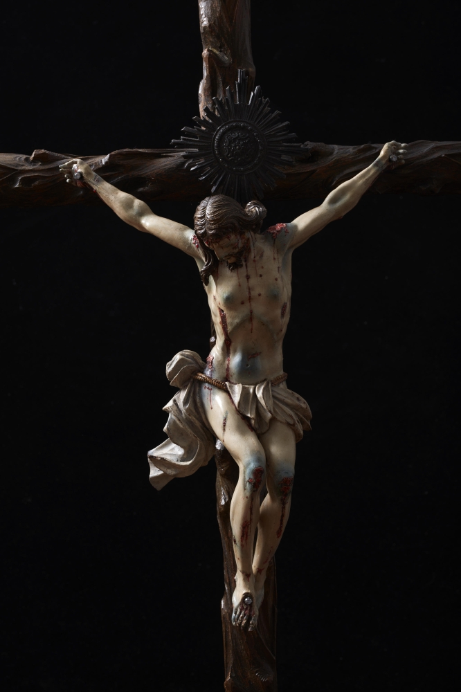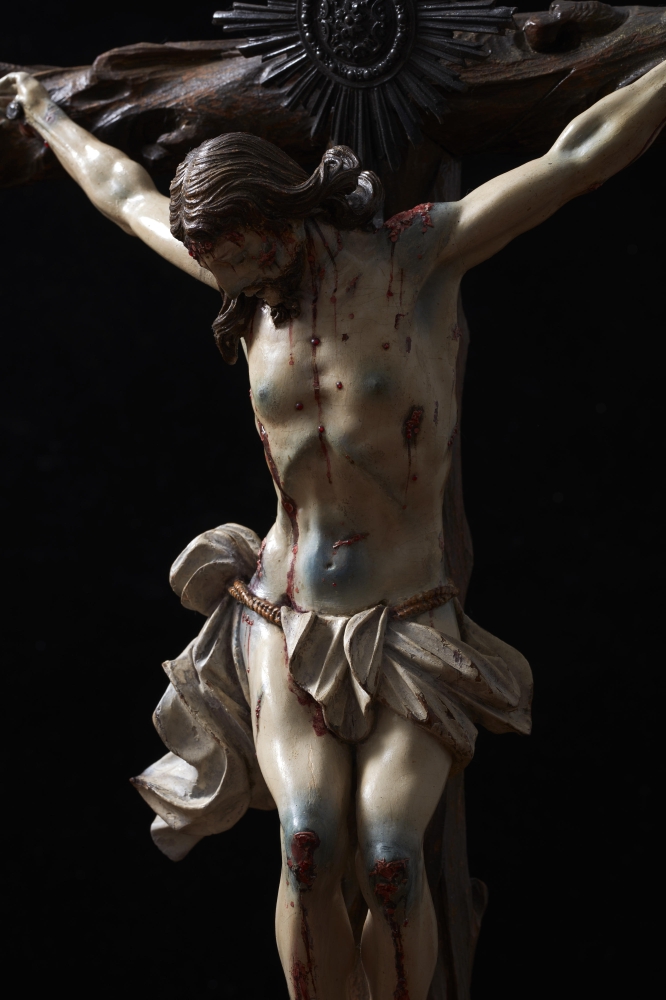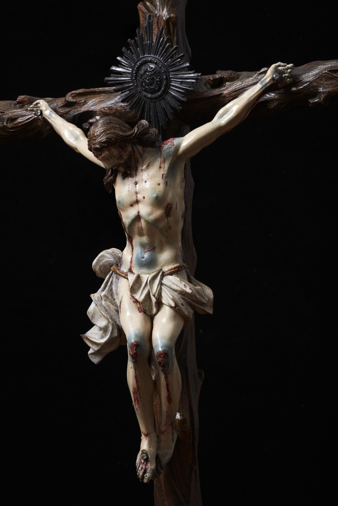 His body was sculpted in pale white with a powerful sense of naturalism, highlighting traces of blood on his hands, knees and feet. Little trails of blood trickle through his thick beard onto his neck and run down his body, further bringing out the whiteness of his skin where his wounds and stigmata contrast strongly with their purple colour, denoting the suffering Christ went through prior to his Crucifixion. The blood and wounds are highlighted by thousands of little rubies and diamonds that reflect the light, and add further dramatism to this Passion scene. His pubis is covered by a perizoma (loincloth), a white cloth with broad folds attached to his body with a cord, finely carved with a great sense of naturalism. His lacerated feet are attached to the foot support by one single nail.