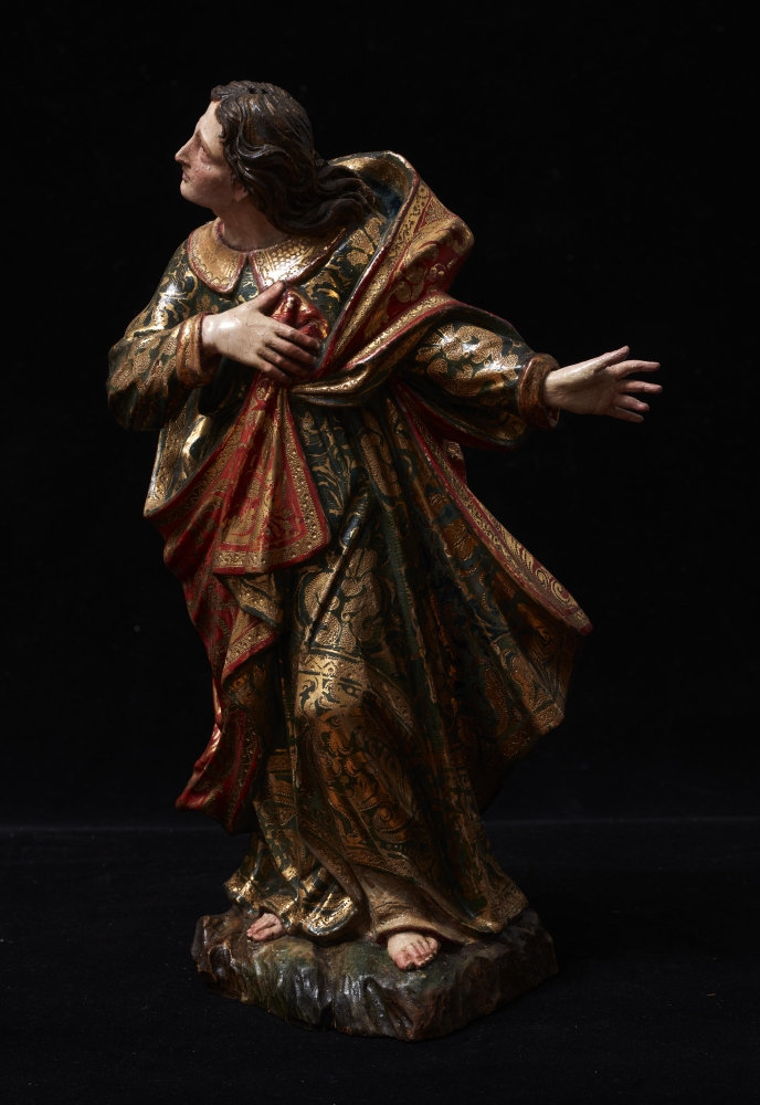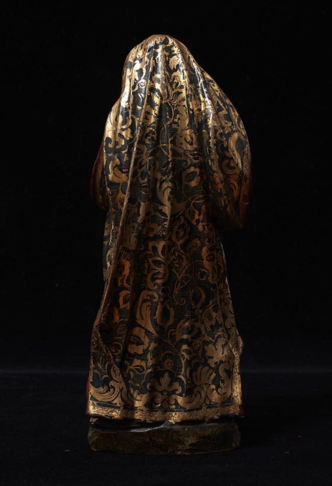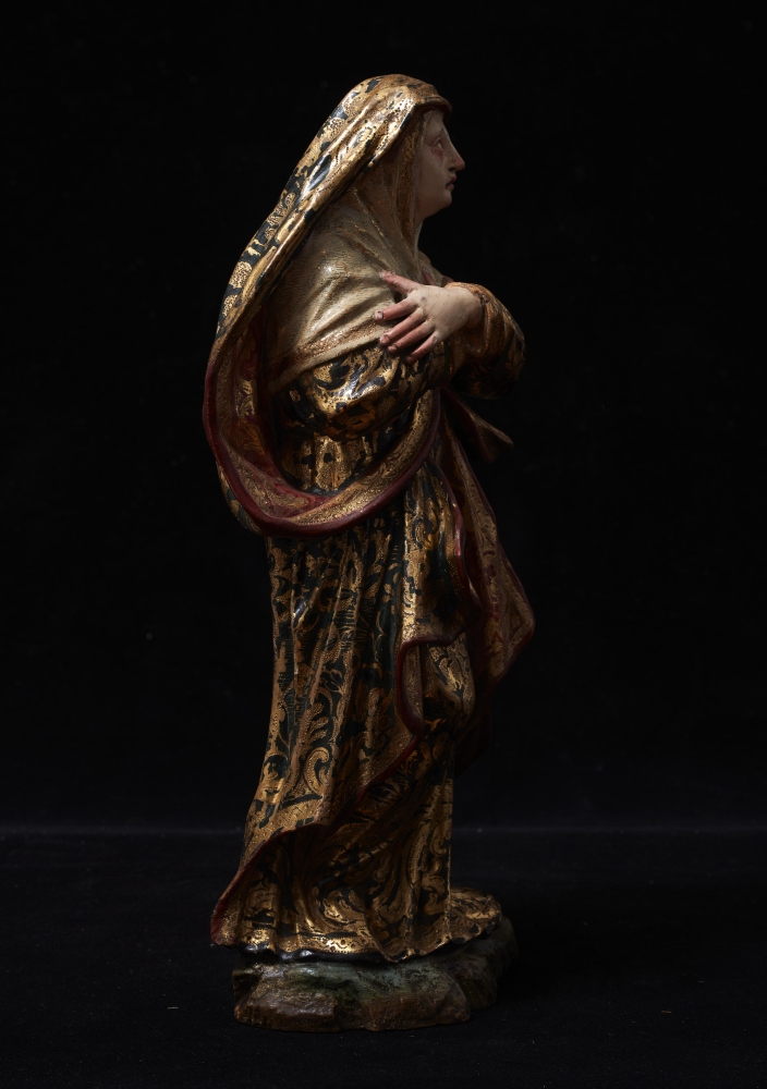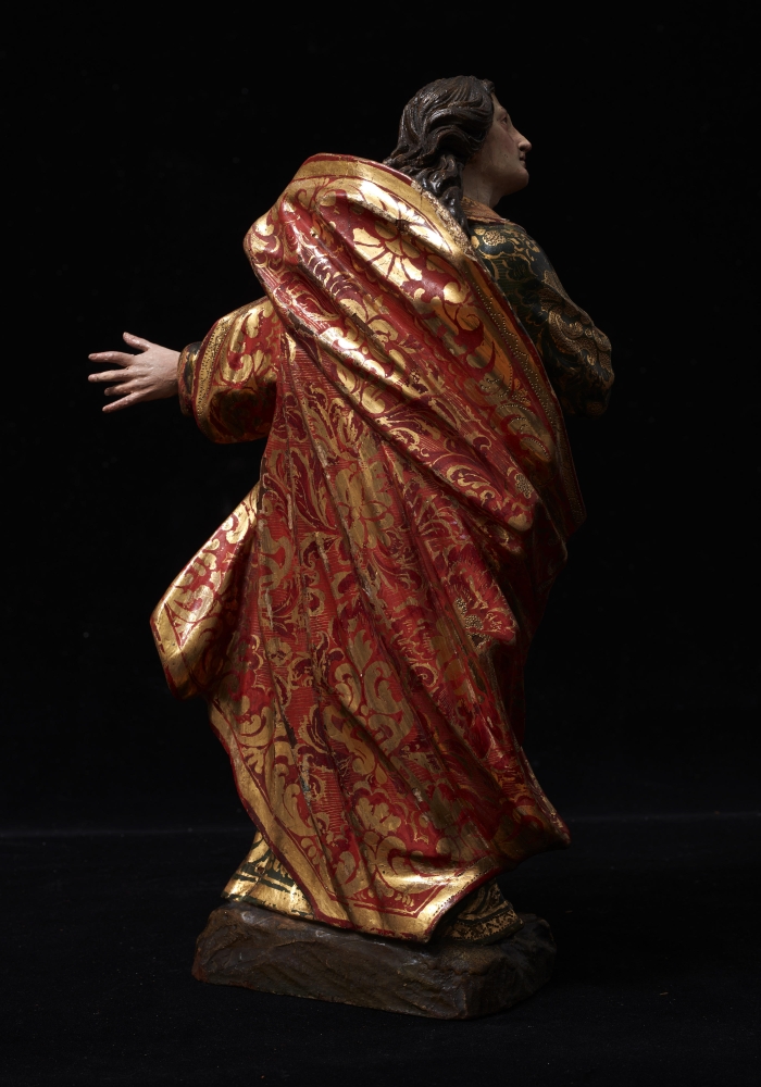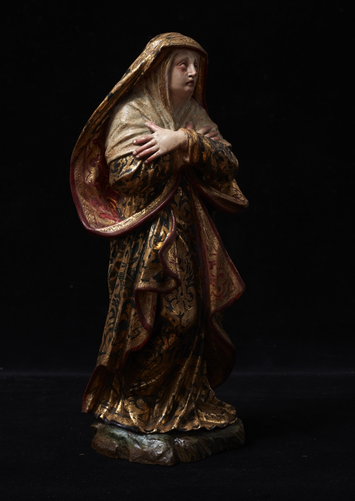 As is characteristic of works by Caspicara, the hands lend tone to the work, and their position forms a dramatic gesture of supplication. An intensely emotive and theatrical execution of the sculpture aimed at evoking feelings of empathy in the spectator.