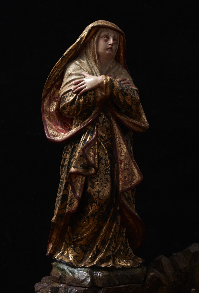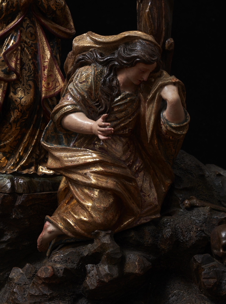 The Mother of Christ is depicted at the foot of the Cross, in an attitude of resignation with her arms crossed against her breast, hugging herself in a demonstration of her great pain and grief. Mary Magdalene is on her knees with her right arm stretched out while her left hand holds her veil, looking disconsolate at the skull and bones of Adam. On the right-hand side we find Saint John with his arms open, sobbing. All express great sorrow and despair, which Caspicara manages to transmit using great skill in the work’s colouring, with subtle differences in the reddish tones around the eyes which show tear tracks, thereby revealing his fine command of expressive execution.