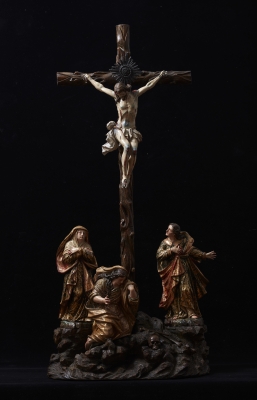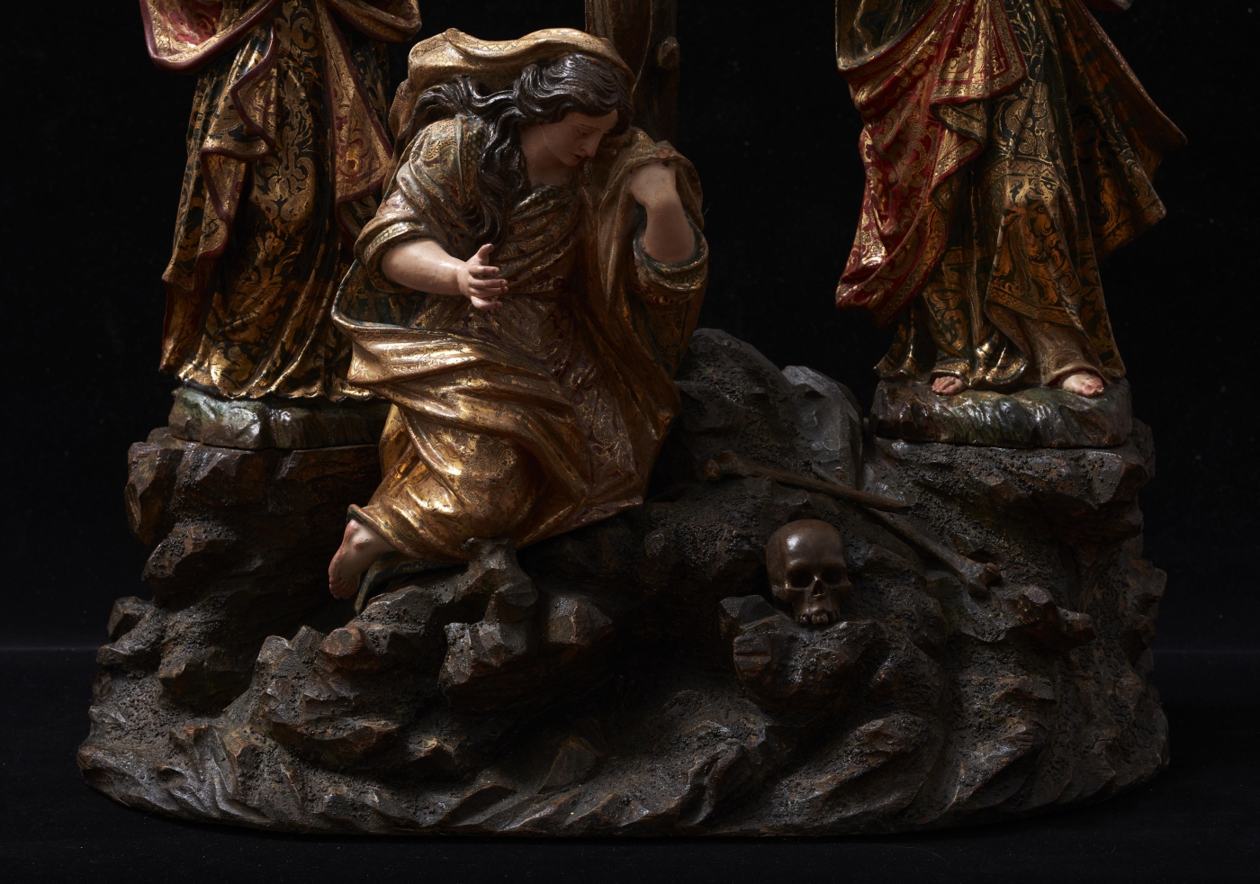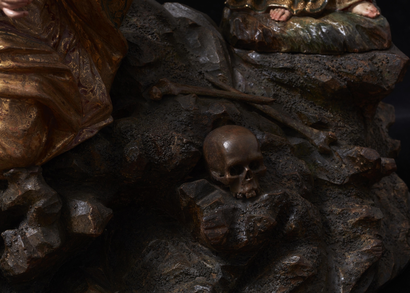 The episode in Christ’s Passion involving the Crucifixion is one of the most representative in colonial-era sculpture in Quito. Generally, the Calvary scenes undertaken for the city’s reredos and oratories present Christ accompanied by his Mother, the Virgin Mary, Mary Magdalene and Saint John. The base is a structure that simulates stone and represents the little mount of Golgotha, on which rest the skull and bones that allude to Adam.