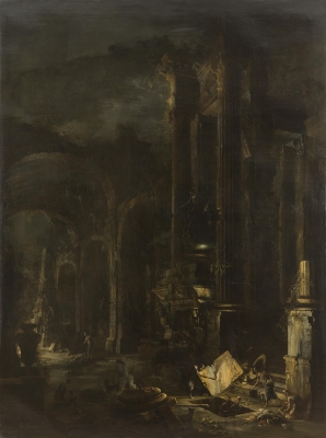 Coccorante’s monumental canvas depicting towering classical ruins is lit only by the flames of torches and silvery moonlight. The torches are carried by witches in the throes of exhuming a skeleton from a tomb. The location of this sorcery is likely a capriccio (a view representing a fantasy or a mixture of real and imaginary features); a subject in which Coccorate specialised.