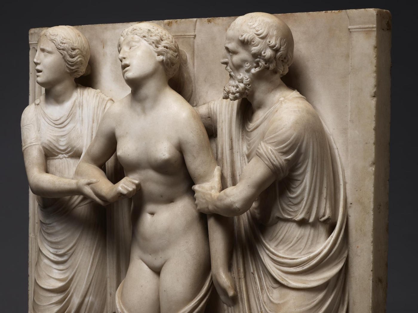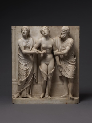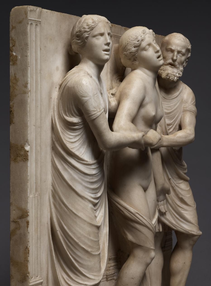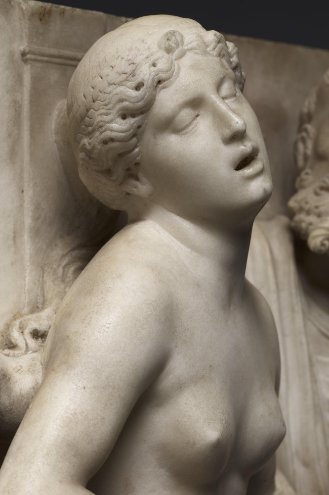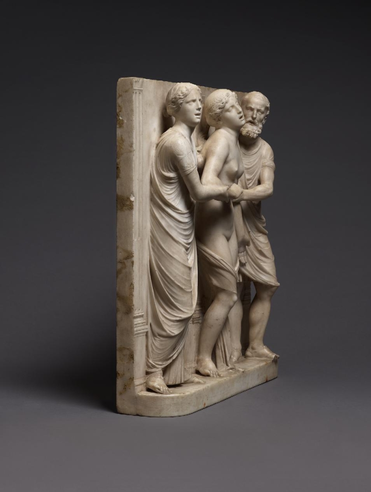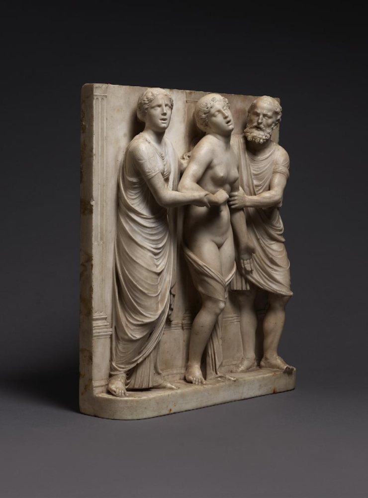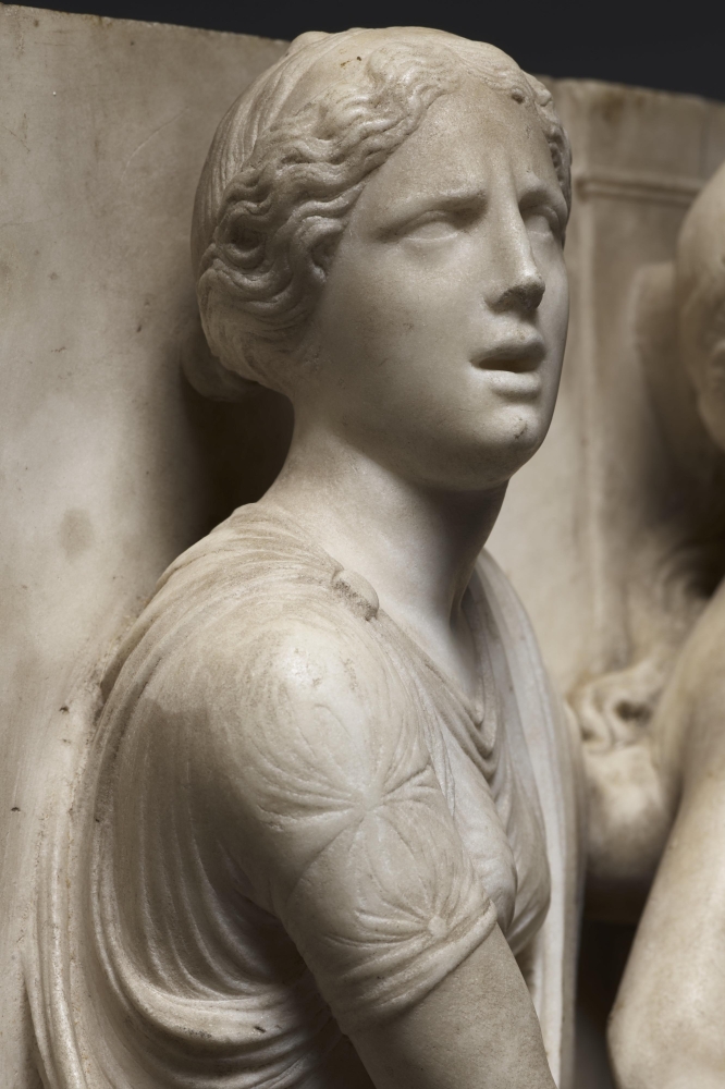 The sculpture depicts the Roman heroine Lucretia as she commits suicide by plunging a dagger into her stomach below her right breast, following her violent rape by Sextus Tarquinius. She is flanked on her left by an elderly man, presumably her father, Spurius Lucretius, and on her right by a young woman, probably her maidservant, who appears to cry out. The figures stand upon a small integral base, curved at the left and right edges, with Lucretius’s left foot projecting over it. Behind the figures are three columns, the one on the left fluted, the others plain, and the beginnings of arches. Holes on the top edge of the relief seem to confirm that there was originally a separately carved top section, which would have completed the arches. Lucretia originally held a small dagger, the hilt of which, now lost, was probably made of metal, inserted into a small hole in her right hand. Other than the loss of the top section, the relief is overall in very good condition, with just some minor losses, such as Spurius Lucretius’s left toes, and the fingers of Lucretia’s left hand. Some areas that would not have been particularly visible have been left unworked – for example, the back parts of Lucretia’s head, or the father’s left thumb.
