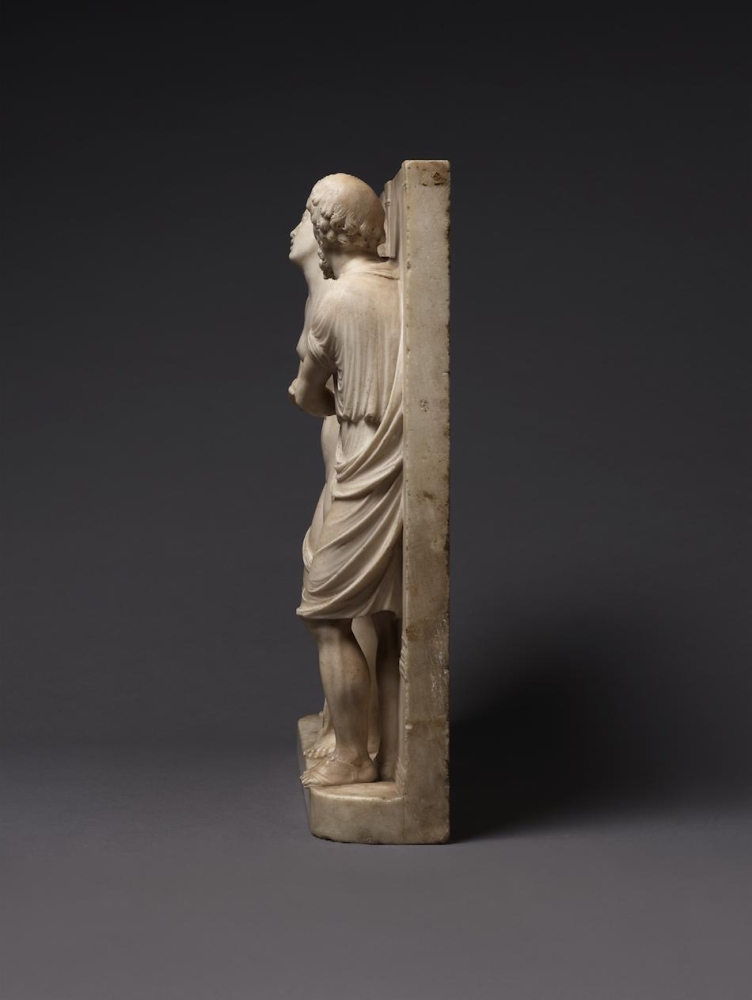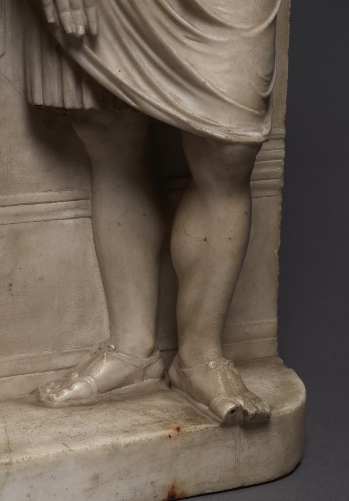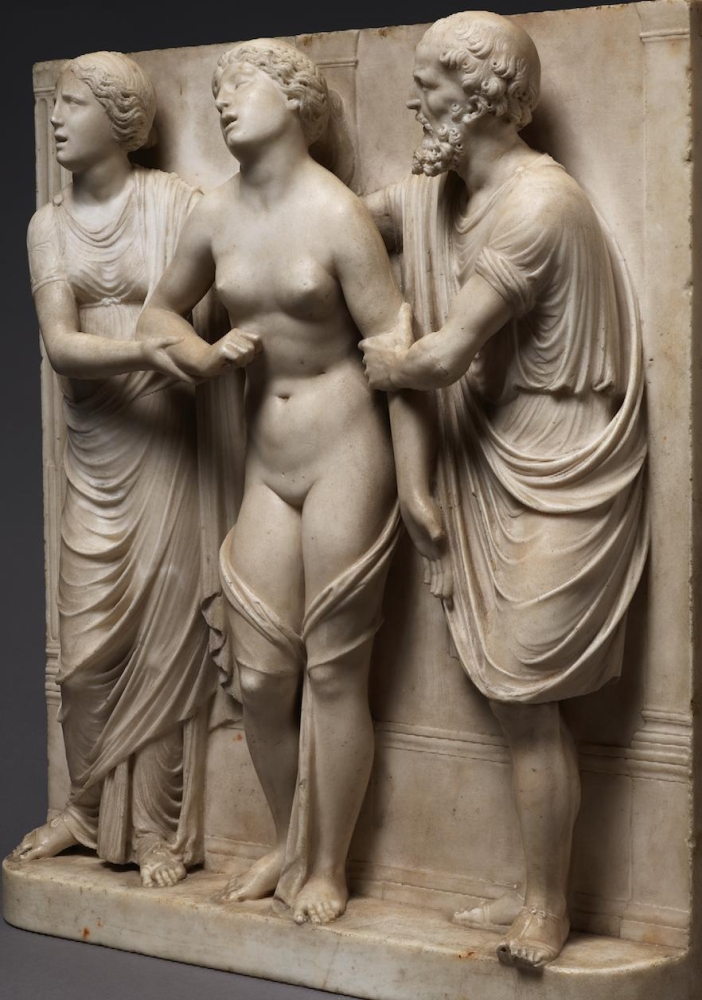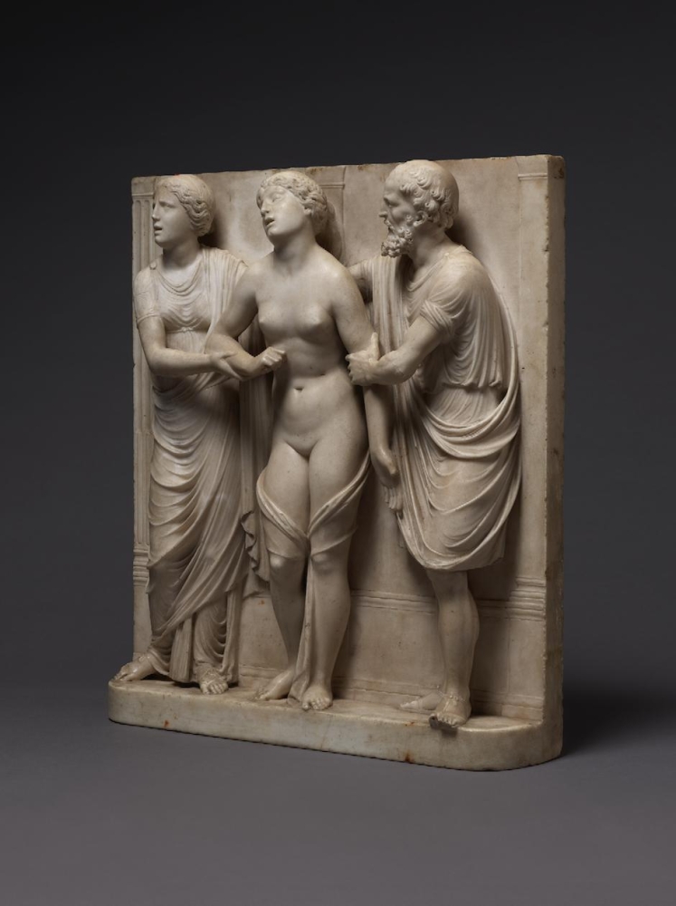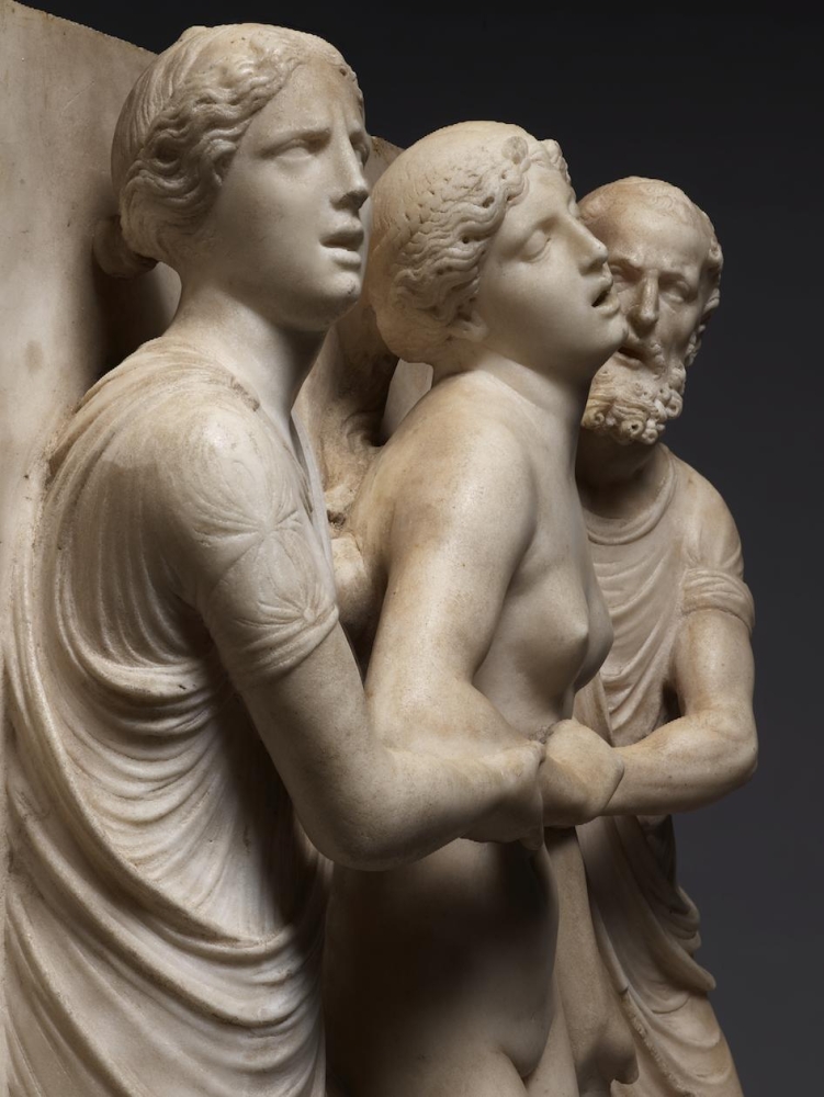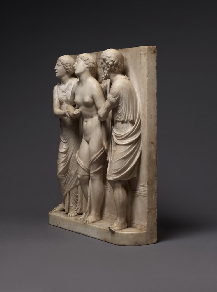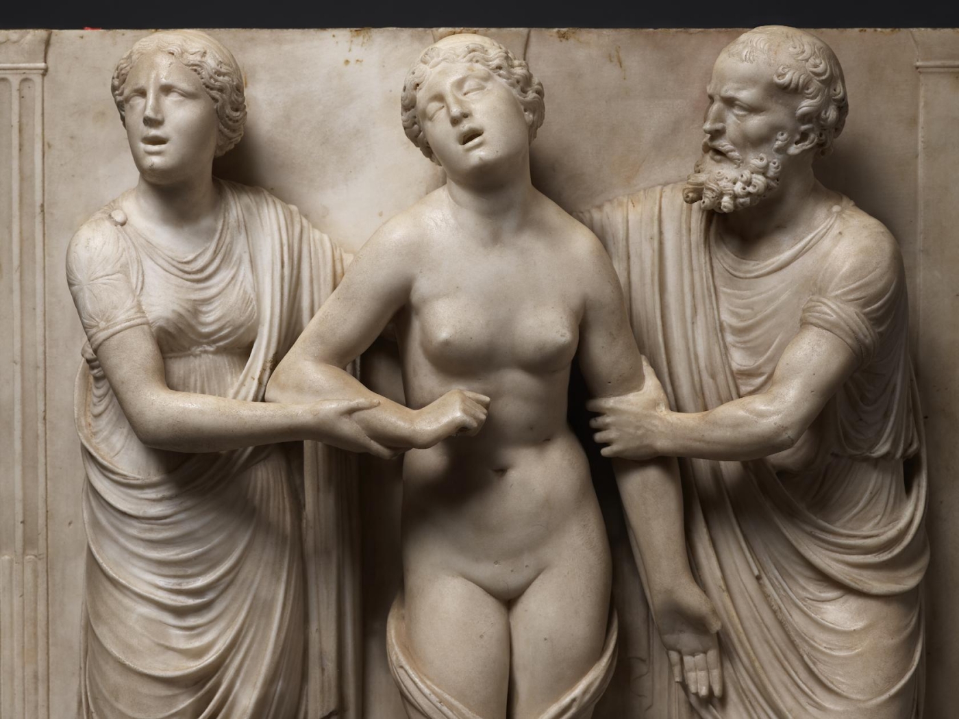 The sculpture depicts the Roman heroine Lucretia as she commits suicide by plunging a dagger into her stomach below her right breast, following her violent rape by Sextus Tarquinius. She is flanked on her left by an elderly man, presumably her father, Spurius Lucretius, and on her right by a young woman, probably her maidservant, who appears to cry out. The figures stand upon a small integral base, curved at the left and right edges, with Lucretius’s left foot projecting over it. Behind the figures are three columns, the one on the left fluted, the others plain, and the beginnings of arches. Holes on the top edge of the relief seem to confirm that there was originally a separately carved top section, which would have completed the arches. Lucretia originally held a small dagger, the hilt of which, now lost, was probably made of metal, inserted into a small hole in her right hand. Other than the loss of the top section, the relief is overall in very good condition, with just some minor losses, such as Spurius Lucretius’s left toes, and the fingers of Lucretia’s left hand. Some areas that would not have been particularly visible have been left unworked – for example, the back parts of Lucretia’s head, or the father’s left thumb.