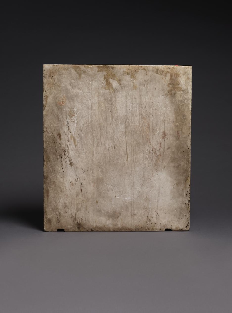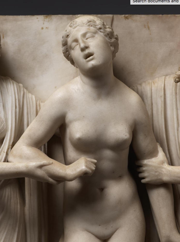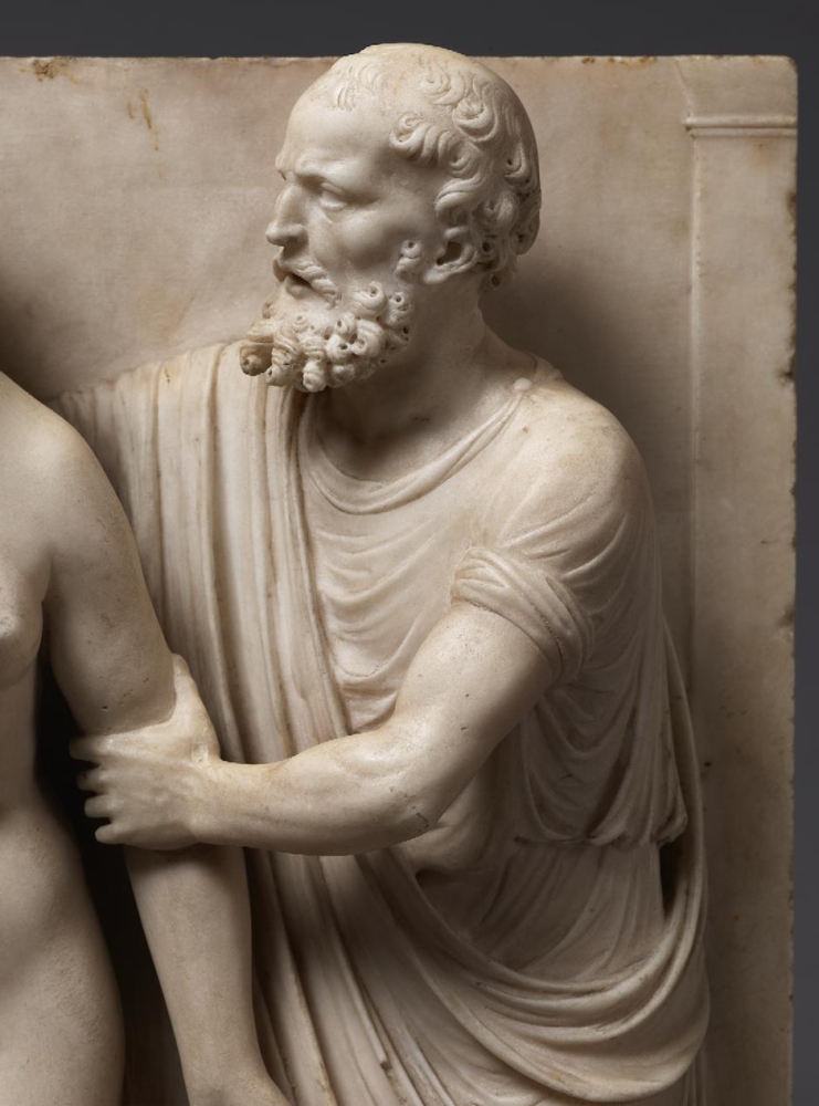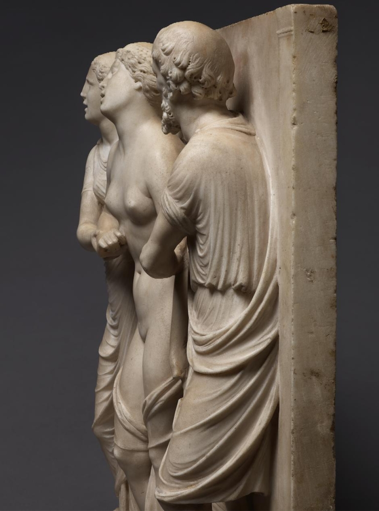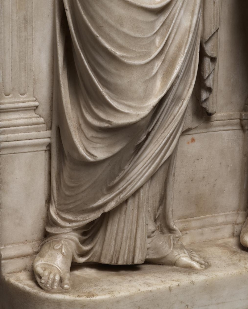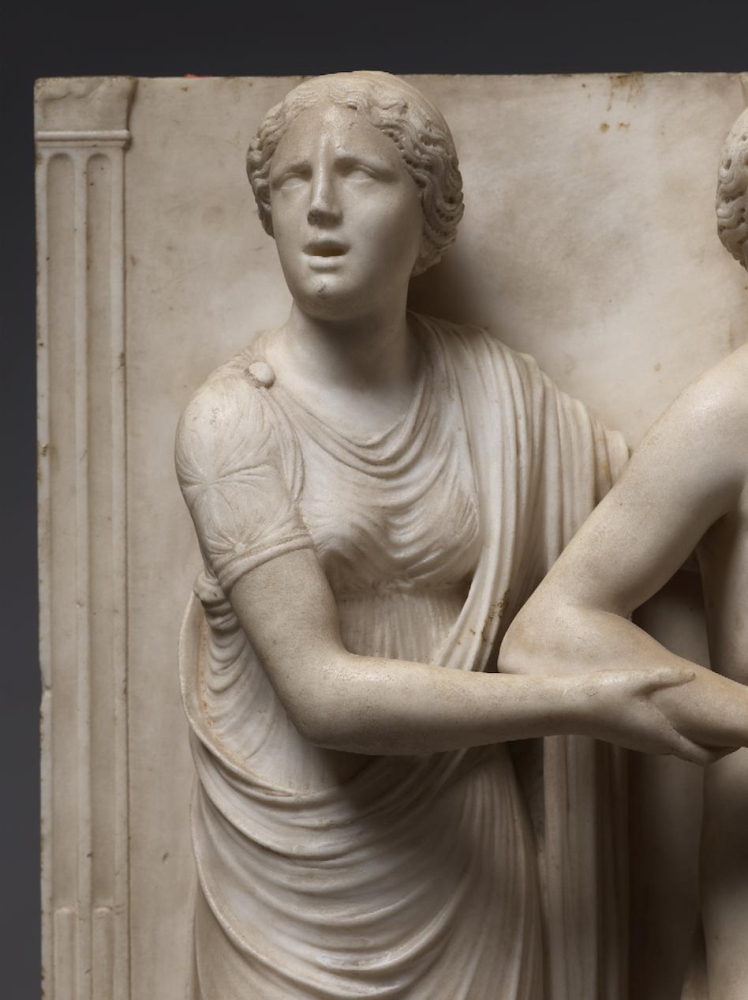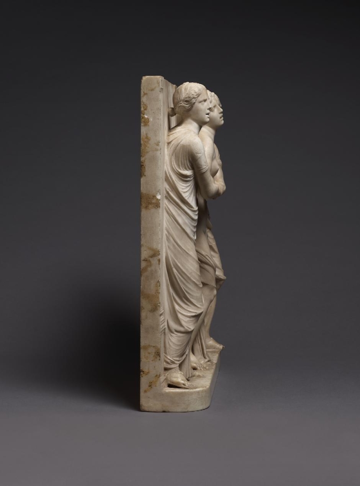 The sculpture depicts the Roman heroine Lucretia as she commits suicide by plunging a dagger into her stomach below her right breast, following her violent rape by Sextus Tarquinius. She is flanked on her left by an elderly man, presumably her father, Spurius Lucretius, and on her right by a young woman, probably her maidservant, who appears to cry out. The figures stand upon a small integral base, curved at the left and right edges, with Lucretius’s left foot projecting over it. Behind the figures are three columns, the one on the left fluted, the others plain, and the beginnings of arches. Holes on the top edge of the relief seem to confirm that there was originally a separately carved top section, which would have completed the arches. Lucretia originally held a small dagger, the hilt of which, now lost, was probably made of metal, inserted into a small hole in her right hand. Other than the loss of the top section, the relief is overall in very good condition, with just some minor losses, such as Spurius Lucretius’s left toes, and the fingers of Lucretia’s left hand. Some areas that would not have been particularly visible have been left unworked – for example, the back parts of Lucretia’s head, or the father’s left thumb.