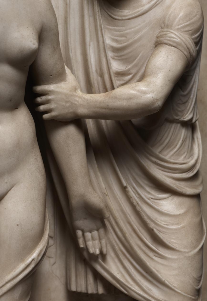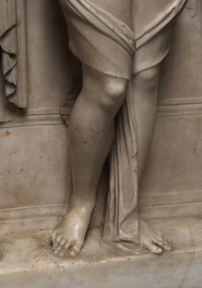 On its appearance at auction in 2020, the relief was attributed to the Venetian sculptor Antonio Lombardo, whose father, Pietro Lombardo (1435–1515), ran the leading architectural and sculptural workshop in Venice in the late fifteenth and early sixteenth centuries, with the active participation of Antonio and his brother, Tullio (c.1455–1532). In 1506 Antonio left Venice for Ferrara, where he worked until his early death in 1516 for Alfonso I d’Este, Duke of Ferrara (1476–1534), one of the greatest patrons of art in Renaissance Italy. The artistic styles of both Antonio and Tullio are based on a refined form of classicism and in many respects are closely similar. It is, nevertheless, possible to distinguish Tullio’s severe and usually rather dry classicism from the fuller and more empathetic style of Antonio. As Anne Markham Schulz has observed, this can best be done by comparing the two reliefs of the Miracle of the Repentant Son and the Miracle of the Speaking Baby, made by Tullio and Antonio respectively for the Chapel of Saint Antony in the Basilica di Sant’Antonio in Padua during the years around 1500–5: ‘a comparison of the brothers’ two reliefs shows Tullio to possess an appreciation of structure and hierarchy analogous to systems of scholastic reasoning, and so obsessive a sense of order, so pronounced a tendency toward abstraction, that Antonio’s composition appears by contrast almost casual’. Other subtle differences can be discerned in the two brothers’ work, including the modelling of draperies, the treatment of hair and the sense of volume in figures.