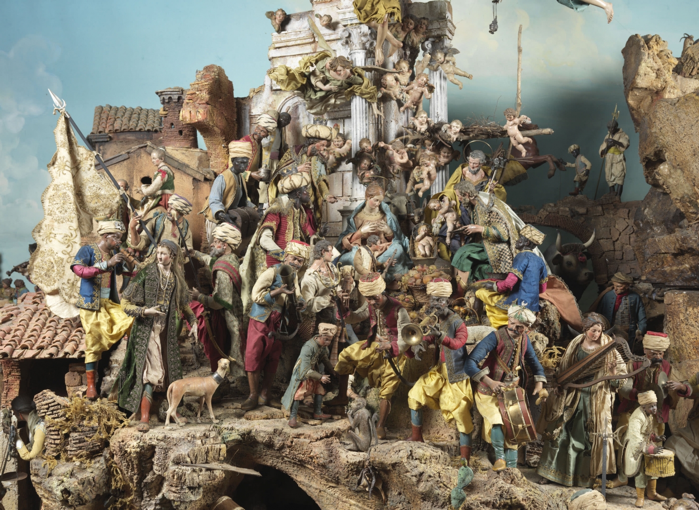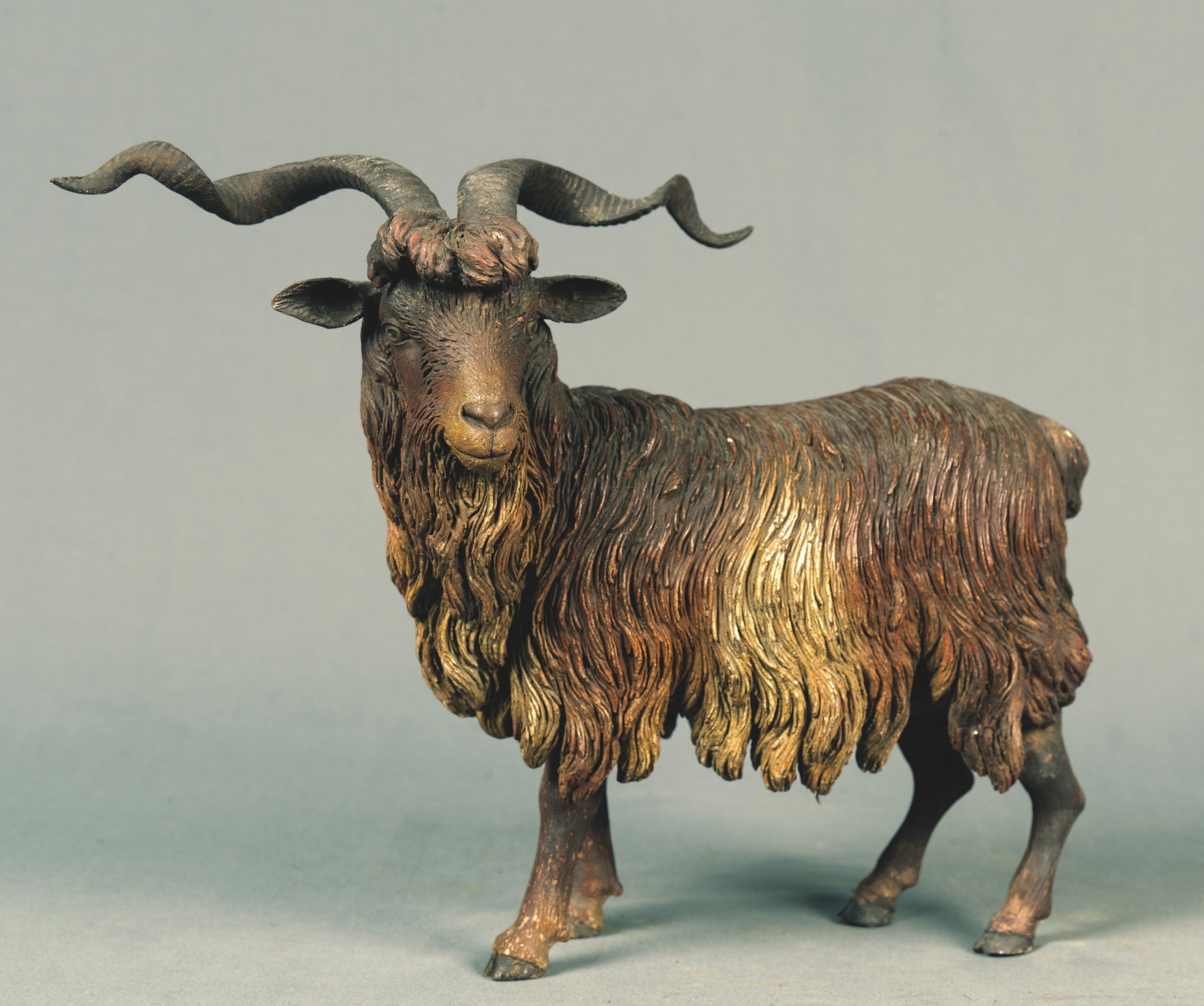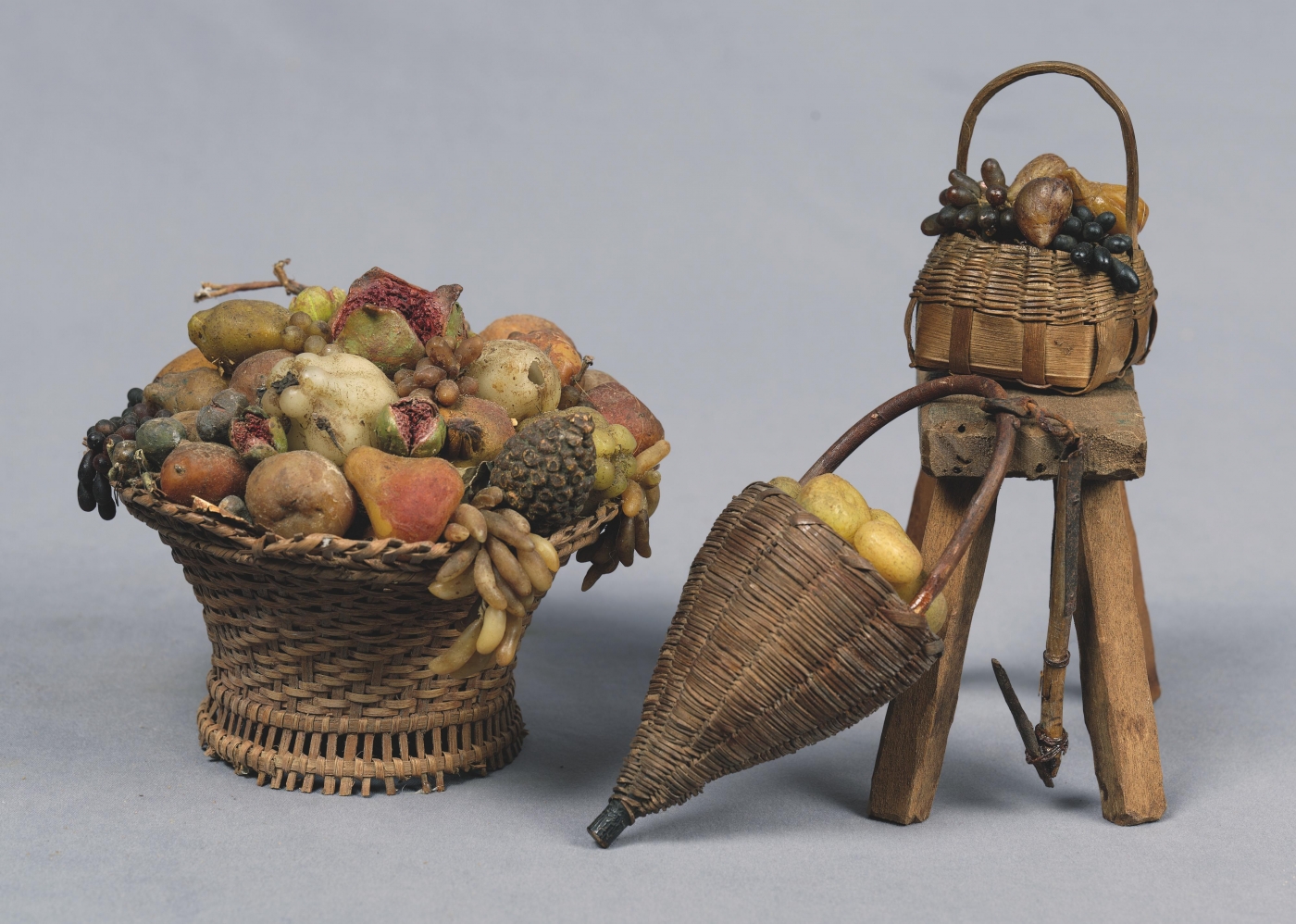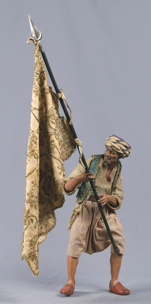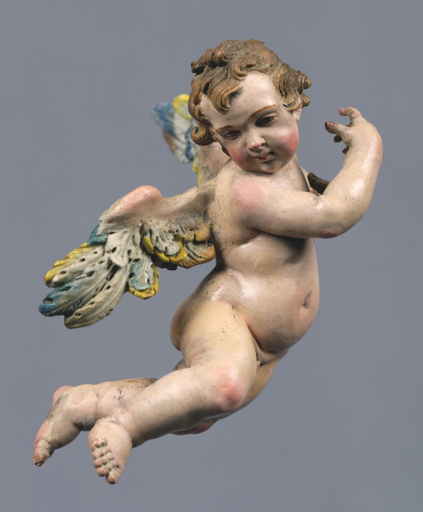 • Oil painted terracotta, carved wood, painted glass, shaped wire, tin and cork, with stitched silks and linen