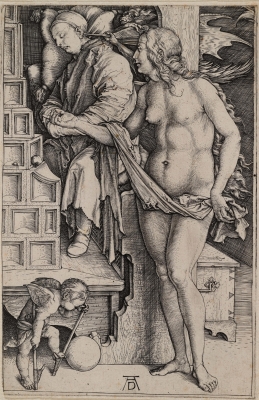 The curious subject of this engraving is linked to contemporary proverbs and literature. An elderly man is asleep, his head resting on cushions next to a warm stove. His inactivity denotes the sin of idleness, as illustrated in a proverb of the day, ‘idling is the pillow of the devil.’ According to medieval theology, laziness begets lewdness and the vice of temptation. Thus, the emblematic, sturdy apparition of the naked woman and the demon using a bellows to puff lustful fantasies into the ear of the dozing idler, making him dream of love while the fumbling Eros tries to raise himself on stilts.