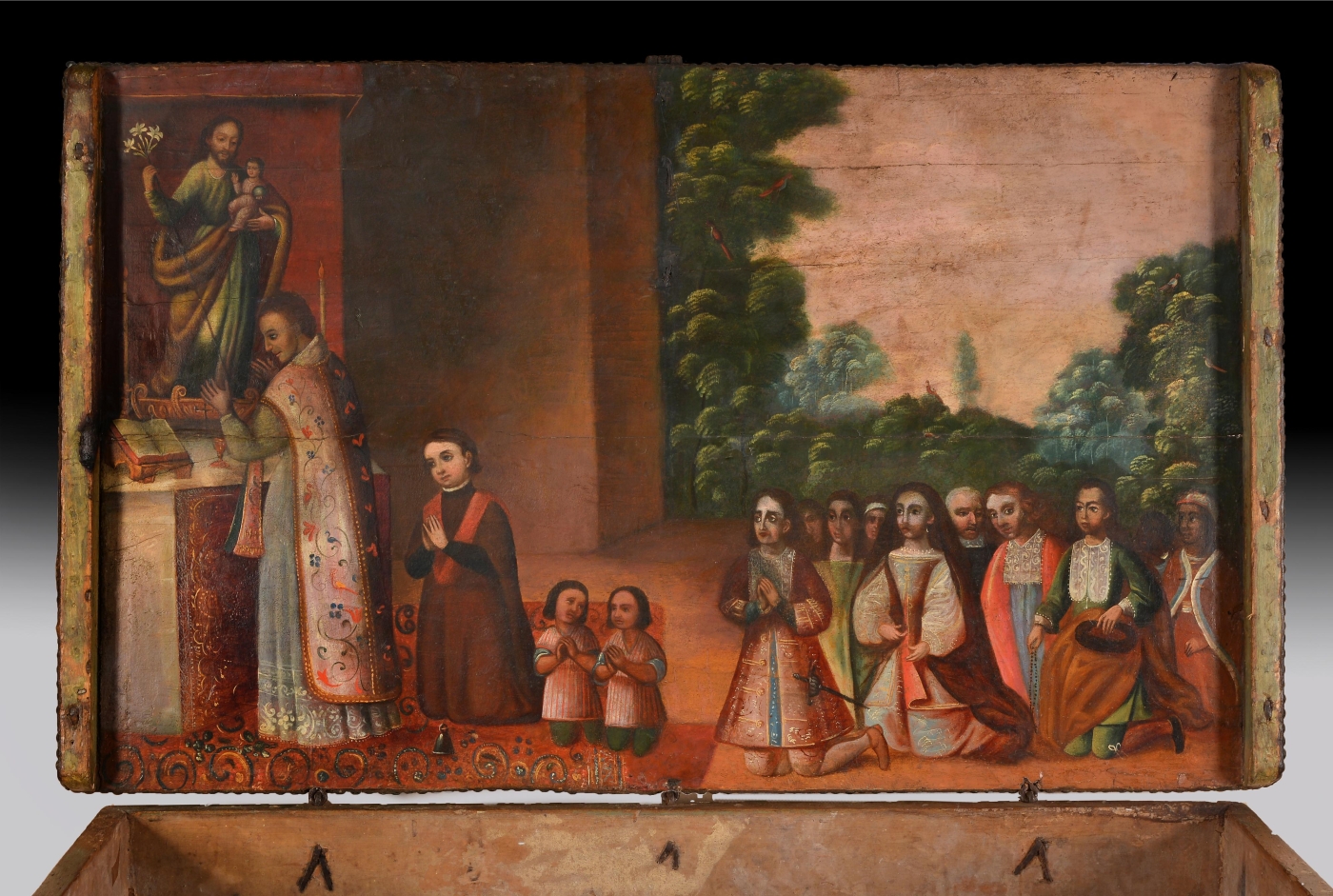 Wooden chest with iron fittings, handles, and lock. Lid of the chest lined in studded leather, with 'S' motifs and the 'IHS' monogram. Paintings on stucco, representing a Eucharistic celebration on the inside and scenes of hunting, fishing, and shepherding on the outside